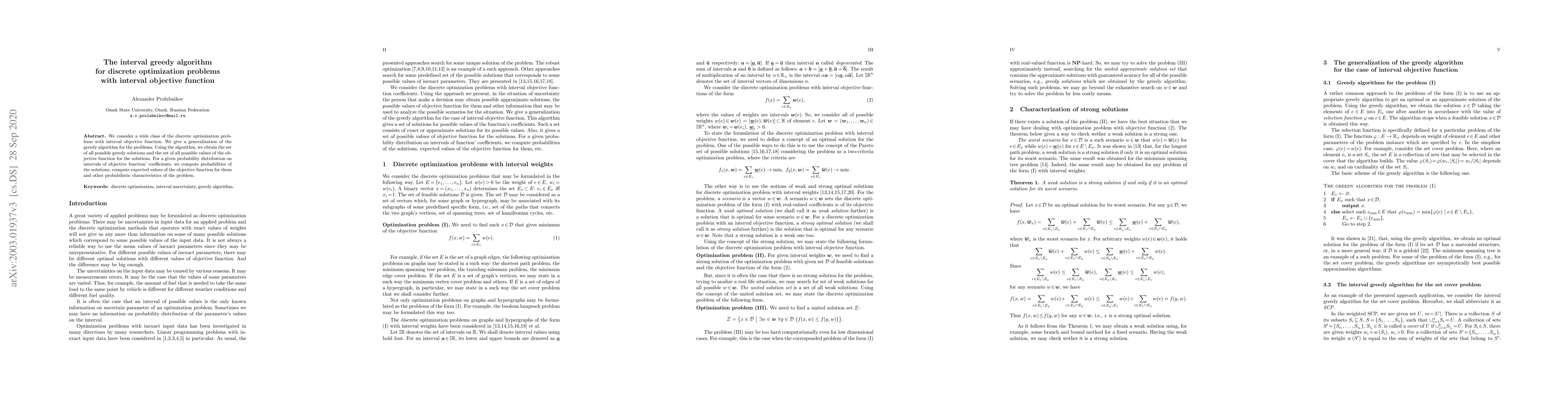 We consider a wide class of the discrete optimization problems with interval objective function. We give a generalization of the greedy algorithm for the problems. Using the algorithm, we obtain the set of all possible greedy solutions and the set of all possible values of the objective function for the solutions. For a given probability distribution on intervals of objective function' coefficients, we compute probabilities of the solutions, compute expected values of the objective function for them and other probabilistic characteristics of the problem.