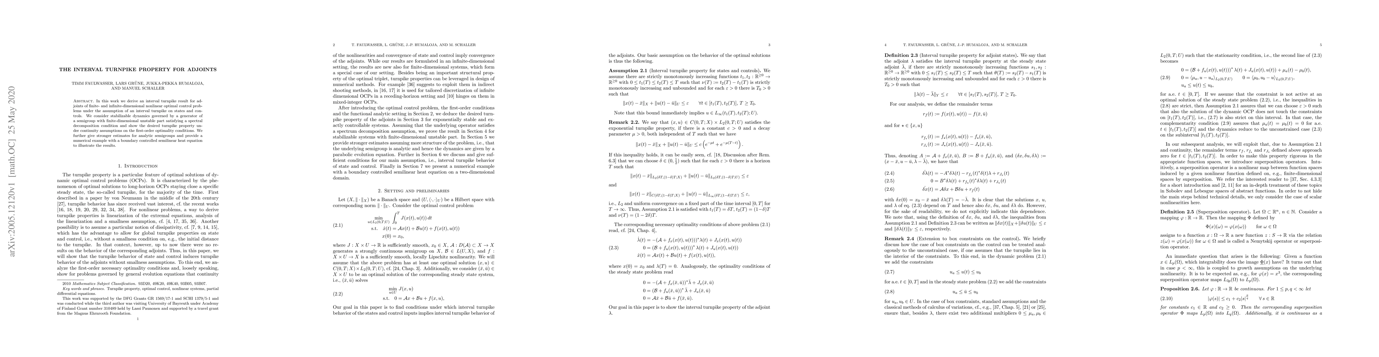 This paper derives an interval turnpike result for adjoints of nonlinear optimal control problems under certain assumptions, showing the existence of a turnpike property for stabilizable dynamics with specific conditions on states and controls.