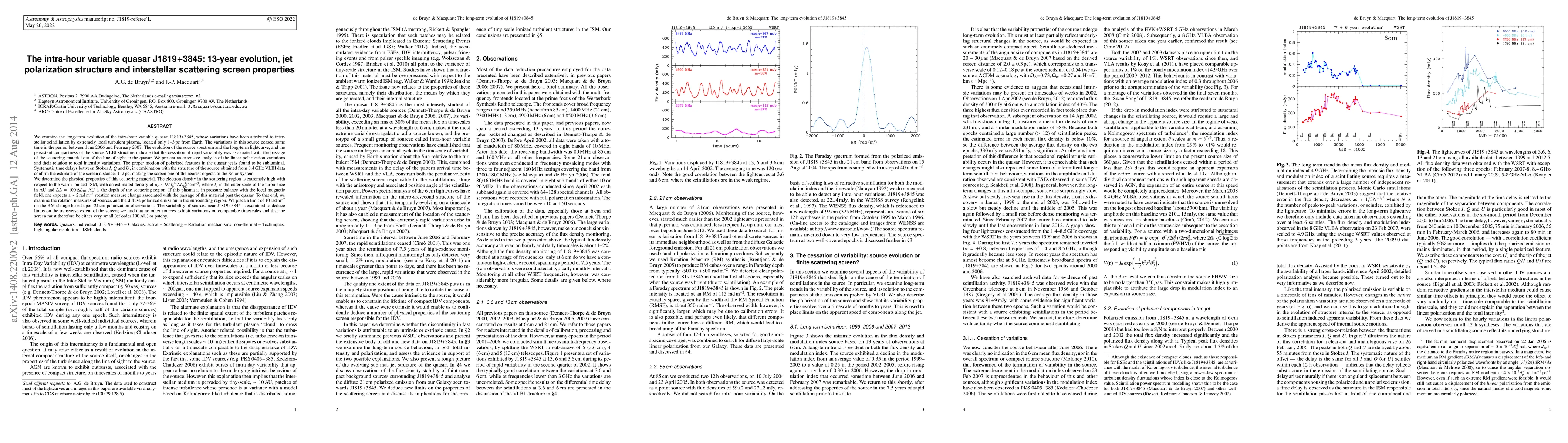 We examine the long-term evolution of the intra-hour variable quasar, J1819+3845, whose variations have been attributed to interstellar scintillation by extremely local turbulent plasma, located only 1-3pc from Earth. The variations in this source ceased some time between June 2006 and February 2007. The evolution of the source spectrum and the long-term lightcurve, and the persistent compactness of the source VLBI structure indicates that the cessation of rapid variability was associated with the passage of the scattering material out of the line of sight to the quasar. We present an analysis of the linear polarization variations and their relation to total intensity variations. The proper motion of polarized features in the quasar jet is found to be subluminal. Systematic time delays between Stokes I, Q and U, in combination with the structure of the source obtained from 8.4GHz VLBI data, confirm the estimate of the screen distance: 1-2pc, making the screen one of the nearest objects to the Solar System. We determine the physical properties of this scattering material. The electron density in the scattering region is extremely high with respect to the warm ionized ISM, with an estimated density of $n_e \sim 97 \, l_0^{1/3} {\Delta L}_{100}^{-1/2}$cm$^{-3}$, where $l_0$ is the outer scale of the turbulence in AU and $\Delta L = 100 \Delta L_{100}$ AU is the depth of the scattering region. If this plasma is in pressure balance with the local magnetic field, one expects a ~2 rad/m^2 rotation measure change associated with the passage of this material past the quasar. We examine the rotation measures of sources and the diffuse polarized emission in the surrounding region. We place a limit of 10 rad/m^2 on the RM change. The variability of sources near J1819+3845 is used to deduce that the screen must therefore be either very small (~100 AU) or patchy.