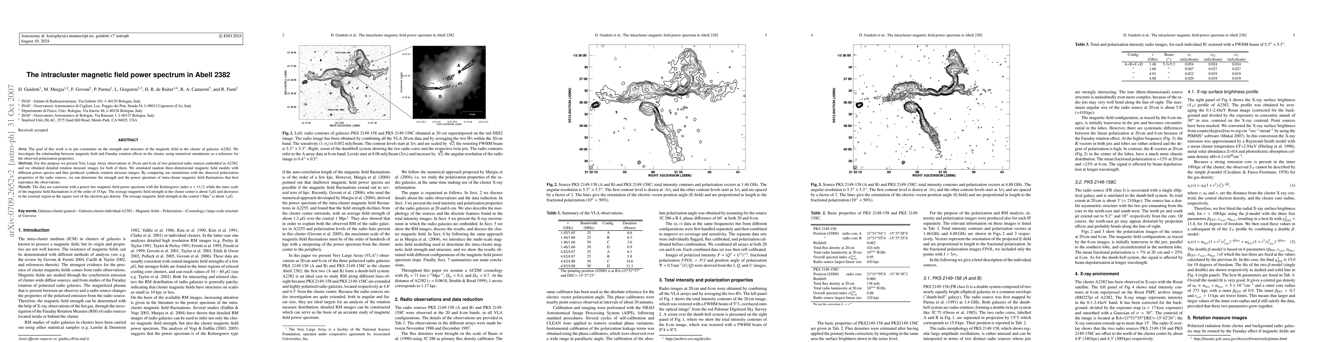 This study constrains the strength and structure of the magnetic field in Abell 2382 using VLA observations and numerical simulations. The analysis reveals a power law magnetic field power spectrum with an index of $n=11/3$ and an average central magnetic field strength of about 3 $\mu$G.