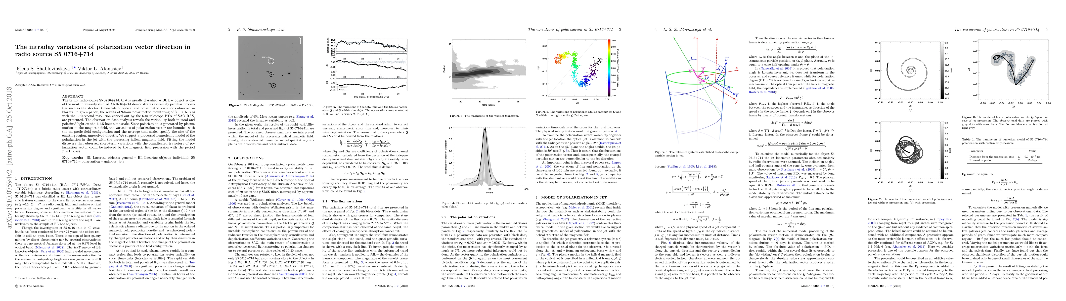 The bright radio source S5 0716+714, that is usually classified as BL Lac object, is one of the most intensively studied. S5 0716+714 demonstrates extremely peculiar properties such as the shortest time-scale of optical and polarimetric variations observed in blazars. In given paper, the results of 9-hour polarimetric monitoring of S5 0716+714 with the $\sim$70-second resolution, carried out by the 6-m telescope BTA of SAO RAS, are presented. The observation data analysis reveals the variability both in total and polarized light on the 1-1.5-hour time-scale. Since polarization is generated by plasma motion in the magnetic field, the variations of polarization vector are bounded with the magnetic field configuration and the average time-scales specify the size of the emitting region, unresolved directly. We suggest a processed numerically model of polarization in the jet with the precessing helical magnetic field. Fitting the model discovers that observed short-term variations with the complicated trajectory of polarization vector could be induced by the magnetic field precession with the period $T \approx 15$ days.