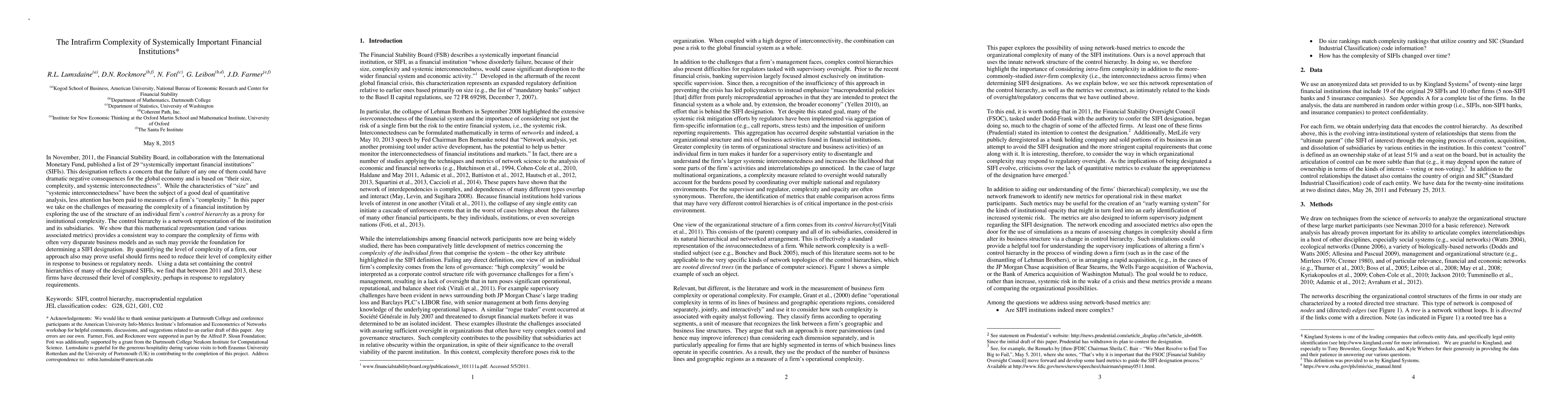 In November, 2011, the Financial Stability Board, in collaboration with the International Monetary Fund, published a list of 29 "systemically important financial institutions" (SIFIs). This designation reflects a concern that the failure of any one of them could have dramatic negative consequences for the global economy and is based on "their size, complexity, and systemic interconnectedness". While the characteristics of "size" and "systemic interconnectedness" have been the subject of a good deal of quantitative analysis, less attention has been paid to measures of a firm's "complexity." In this paper we take on the challenges of measuring the complexity of a financial institution and to that end explore the use of the structure of an individual firm's control hierarchy as a proxy for institutional complexity. The control hierarchy is a network representation of the institution and its subsidiaries. We show that this mathematical representation (and various associated metrics) provides a consistent way to compare the complexity of firms with often very disparate business models and as such may provide the foundation for determining a SIFI designation. By quantifying the level of complexity of a firm, our approach also may prove useful should firms need to reduce their level of complexity either in response to business or regulatory needs. Using a data set containing the control hierarchies of many of the designated SIFIs, we find that in the past two years, these firms have decreased their level of complexity, perhaps in response to regulatory requirements.
