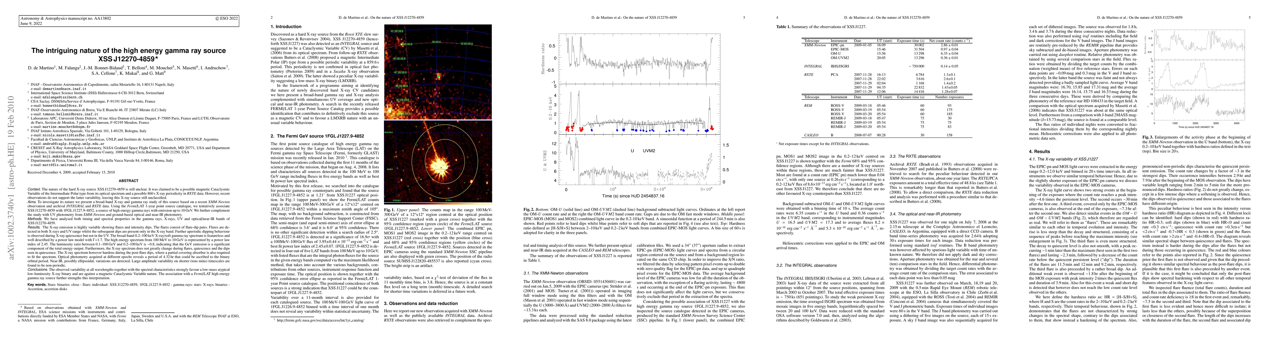 This paper investigates the enigmatic high energy gamma ray source XSSJ12270-4859, revealing it exhibits variable X-ray emission with flares and dips, and a spectrum consistent with a low-mass atypical X-ray binary. The study suggests it is not a Cataclysmic Variable but aligns with a low-luminosity X-ray binary, supported by its association with a high energy gamma ray source.