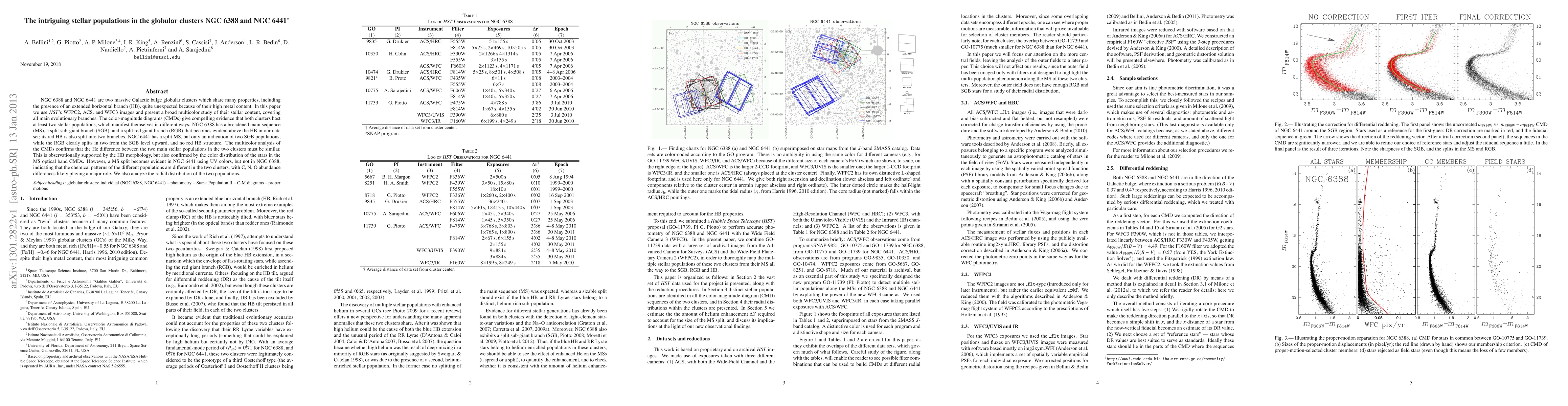 This paper uses HST imaging to study the stellar populations in globular clusters NGC 6388 and NGC 6441, revealing evidence of at least two distinct stellar populations in both, with notable differences in their horizontal branch and main sequence features. The study highlights chemical pattern differences, likely due to variations in C, N, O abundances.