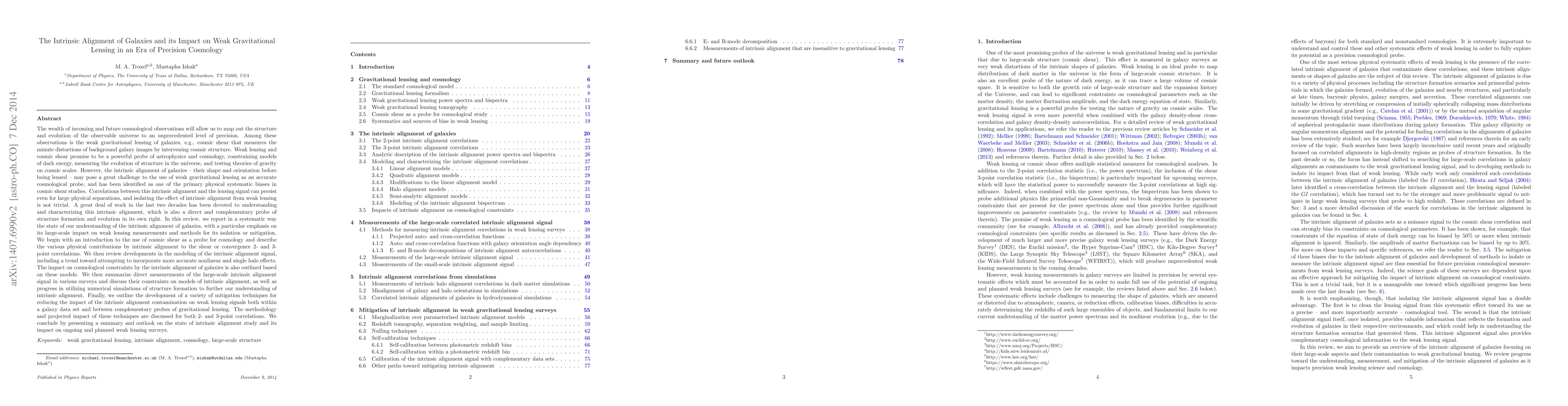 This paper reviews the intrinsic alignment of galaxies and its significant impact on weak gravitational lensing, a key tool for precision cosmology. It discusses the challenges intrinsic alignment poses to cosmic shear studies and the methods developed to isolate or mitigate its effects, emphasizing the large-scale implications for cosmological models.