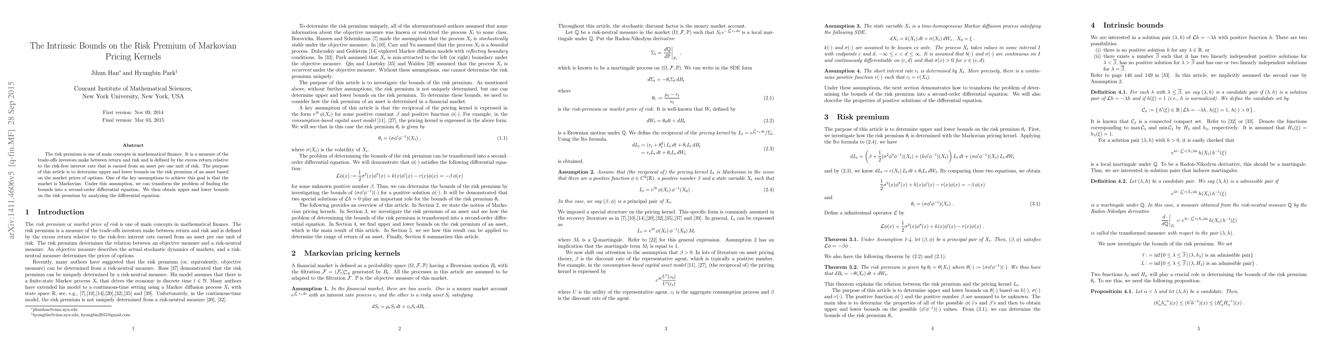 Researchers derived upper and lower bounds on the risk premium of an asset based on market options prices under Markovian pricing kernel assumptions. These bounds provide a framework for investors to make informed decisions about trade-offs between return and risk.
