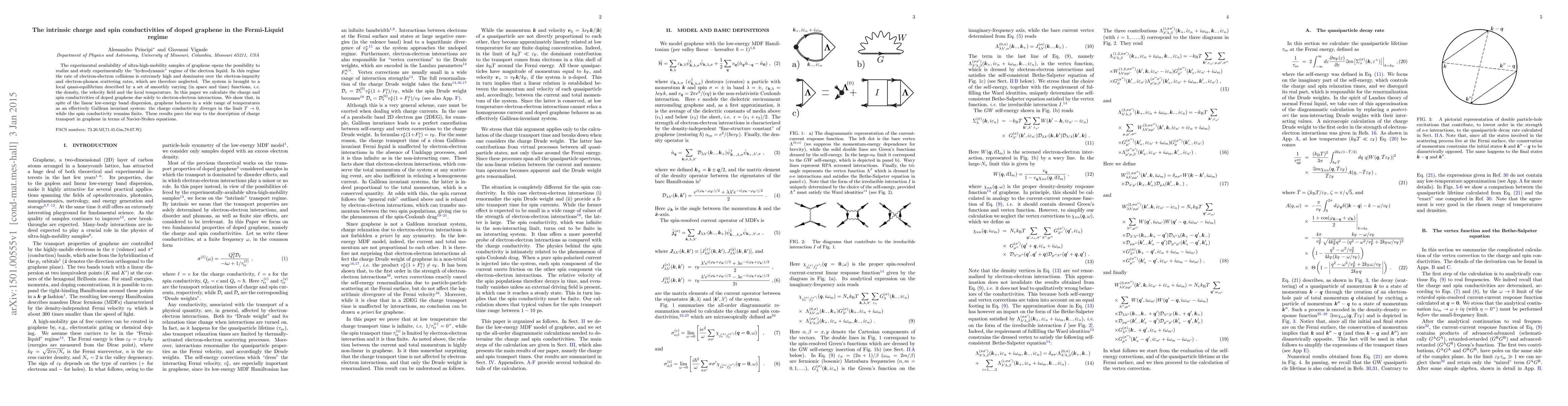 The experimental availability of ultra-high-mobility samples of graphene opens the possibility to realize and study experimentally the "hydrodynamic" regime of the electron liquid. In this regime the rate of electron-electron collisions is extremely high and dominates over the electron-impurity and electron-phonon scattering rates, which are therefore neglected. The system is brought to a local quasi-equilibrium described by a set of smoothly varying (in space and time) functions, {\it i.e.} the density, the velocity field and the local temperature. In this paper we calculate the charge and spin conductivities of doped graphene due solely to electron-electron interactions. We show that, in spite of the linear low-energy band dispersion, graphene behaves in a wide range of temperatures as an effectively Galilean invariant system: the charge conductivity diverges in the limit $T \to 0$, while the spin conductivity remains finite. These results pave the way to the description of charge transport in graphene in terms of Navier-Stokes equations.