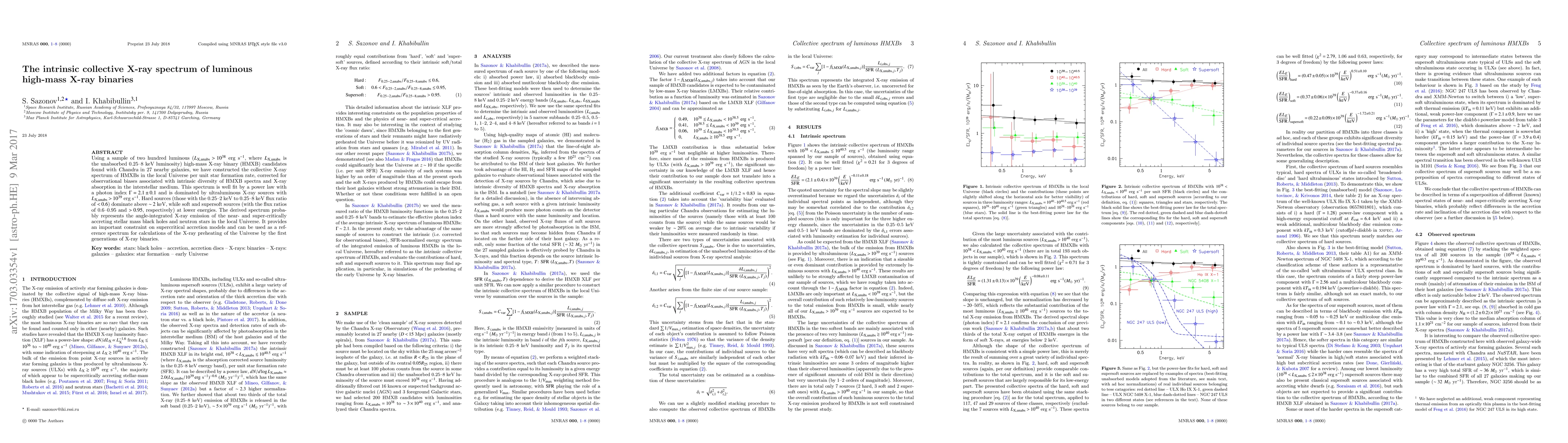 Using a sample of two hundred luminous (L_unabs>10^38 erg/s, where L_unabs is the unabsorbed 0.25-8 keV luminosity) high-mass X-ray binary (HMXB) candidates found with Chandra in 27 nearby galaxies, we have constructed the collective X-ray spectrum of HMXBs in the local Universe per unit star formation rate, corrected for observational biases associated with intrinsic diversity of HMXB spectra and X-ray absorption in the interstellar medium. This spectrum is well fit by a power law with a photon index Gamma=2.1+/-0.1 and is dominated by ultraluminous X-ray sources with L_unabs>10^39 erg/s. Hard sources (those with the 0.25-2 keV to 0.25-8 keV flux ratio of <0.6) dominate above ~2 keV, while soft and supersoft sources (with the flux ratios of 0.6-0.95 and >0.95, respectively) at lower energies. The derived spectrum probably represents the angle-integrated X-ray emission of the near- and super-critically accreting stellar mass black holes and neutron stars in the local Universe. It provides an important constraint on supercritical accretion models and can be used as a reference spectrum for calculations of the X-ray preheating of the Universe by the first generations of X-ray binaries.