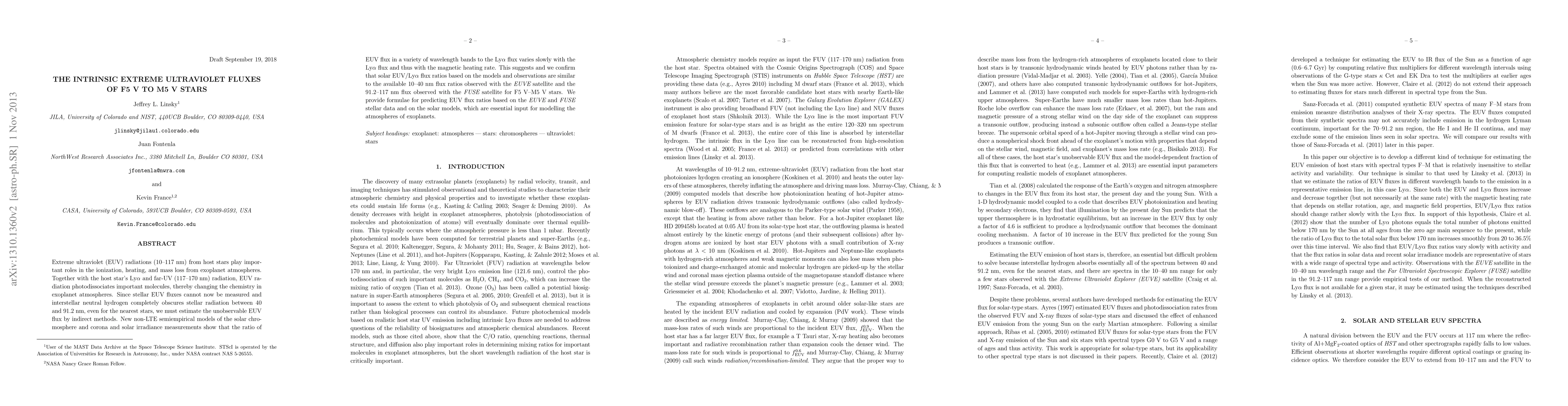 This paper estimates the intrinsic extreme ultraviolet (EUV) fluxes of F5 V to M5 V stars using indirect methods due to observational limitations. It confirms that solar EUV/Lyman-alpha flux ratios are similar to those observed in these stars, providing essential formulae for predicting EUV flux ratios to model exoplanet atmospheres.