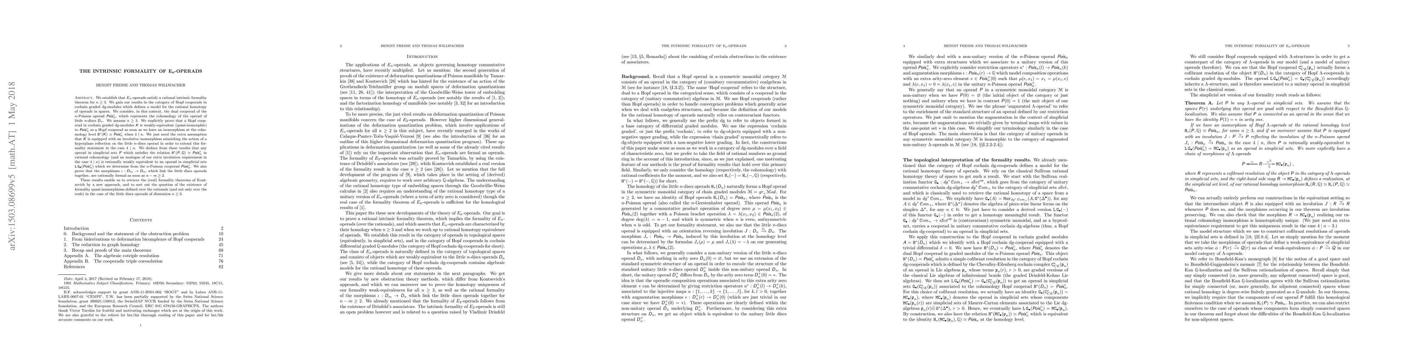 The paper establishes the rational intrinsic formality theorem for $E_n$-operads for $n \geq 3$, utilizing Hopf cooperads in cochain graded dg-modules, which model the rational homotopy of operads in spaces.