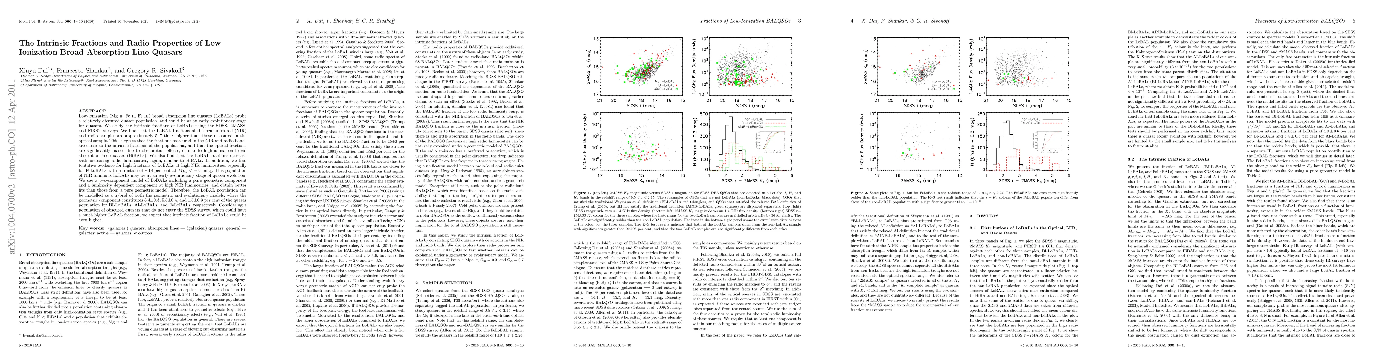 This study investigates the intrinsic fractions and radio properties of low-ionization broad absorption line quasars (LoBALs) using SDSS, 2MASS, and FIRST surveys. It finds that LoBAL fractions are significantly higher in near-infrared and radio samples compared to optical samples, suggesting optical measurements are biased by obscuration. The LoBAL fractions decrease with increasing radio luminosity and show a high fraction in NIR luminous quasars, indicating an early evolutionary stage. A hybrid model combining geometric and evolutionary components provides a better fit for the LoBAL population.