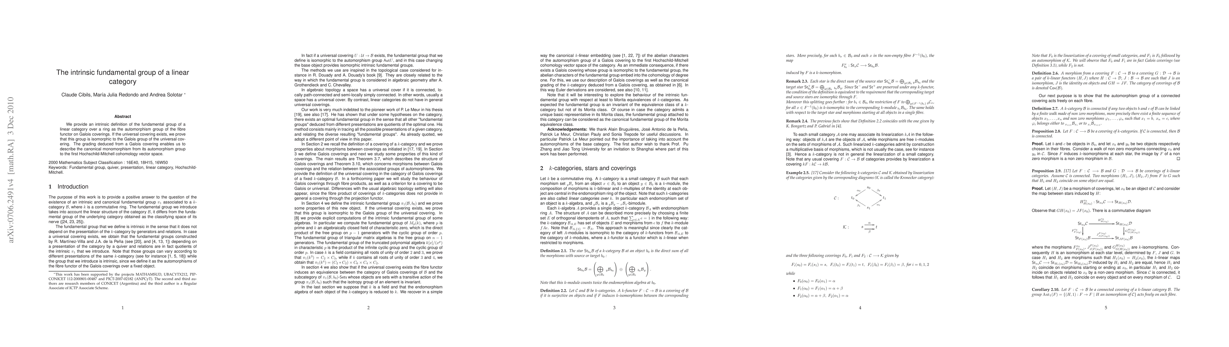 We provide an intrinsic definition of the fundamental group of a linear category over a ring as the automorphism group of the fibre functor on Galois coverings. If the universal covering exists, we prove that this group is isomorphic to the Galois group of the universal covering. The grading deduced from a Galois covering enables us to describe the canonical monomorphism from its automorphism group to the first Hochschild-Mitchell cohomology vector space.