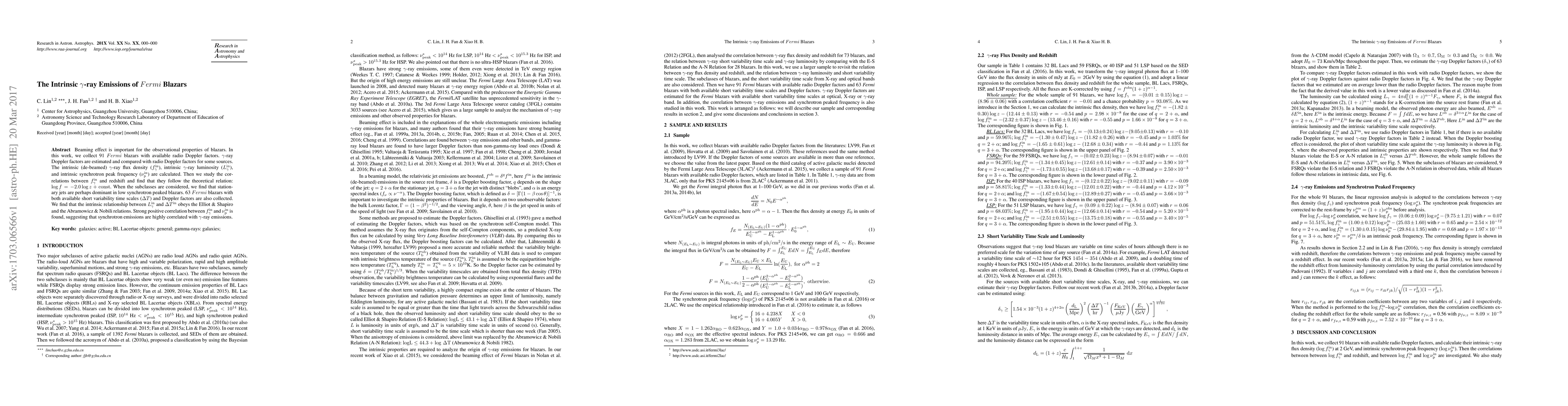 Beaming effect is important for the observational properties of blazars. In this work, we collect 91 $Fermi$ blazars with available radio Doppler factors. $\gamma$-ray Doppler factors are estimated and compared with radio Doppler factors for some sources. The intrinsic (de-beamed) $\gamma$-ray flux density ($f^{\rm in}_{\gamma}$), intrinsic $\gamma$-ray luminosity ($L^{\rm in}_{\gamma}$), and intrinsic synchrotron peak frequency ($\nu_{\rm p}^{\rm in}$) are calculated. Then we study the correlations between $f^{\rm in}_{\gamma}$ and redshift and find that they follow the theoretical relation: $\log f = -2.0 \log z + {\rm const}$. When the subclasses are considered, we find that stationary jets are perhaps dominant in low synchrotron peaked blazars. 63 $Fermi$ blazars with both available short variability time scales ($\Delta T$) and Doppler factors are also collected. We find that the intrinsic relationship between $L ^{\rm in}_{\gamma}$ and $\Delta T^{\rm in}$ obeys the Elliot \& Shapiro and the Abramowicz \& Nobili relations. Strong positive correlation between $f_{\gamma}^{\rm in}$ and $\nu_{\rm p}^{\rm in}$ is found, suggesting that synchrotron emissions are highly correlated with $\gamma$-ray emissions.