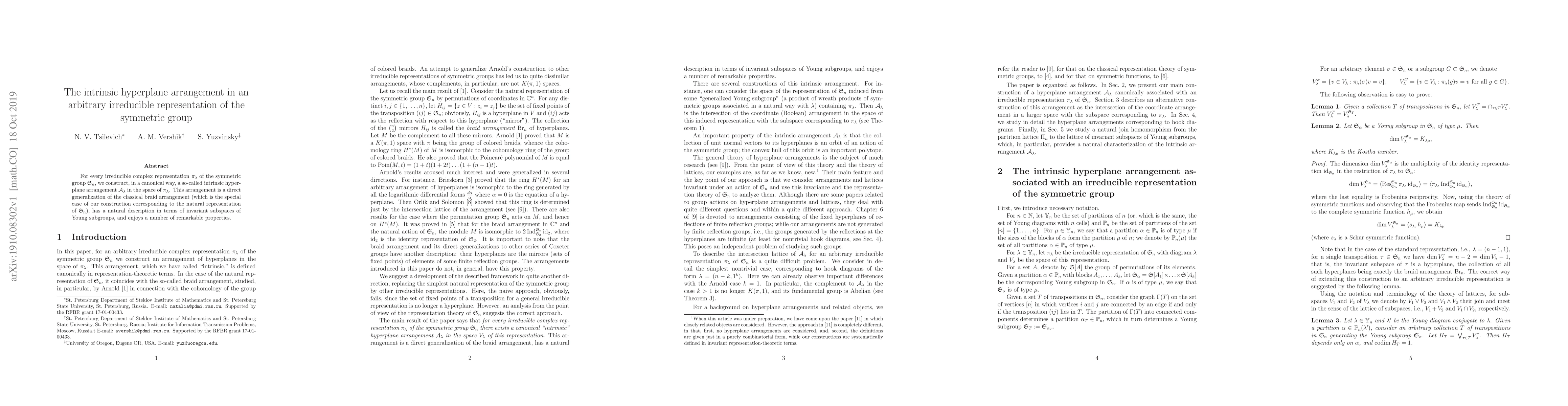 For every irreducible complex representation~$\pi_\lambda$ of the symmetric group~$\S_n$, we construct, in a canonical way, a so-called intrinsic hyperplane arrangement~$\A_{\lambda}$ in the space of~$\pi_\lambda$. This arrangement is a direct generalization of the classical braid arrangement (which is the special case of our construction corresponding to the natural representation of~$\S_n$), has a natural description in terms of invariant subspaces of Young subgroups, and enjoys a number of remarkable properties.
