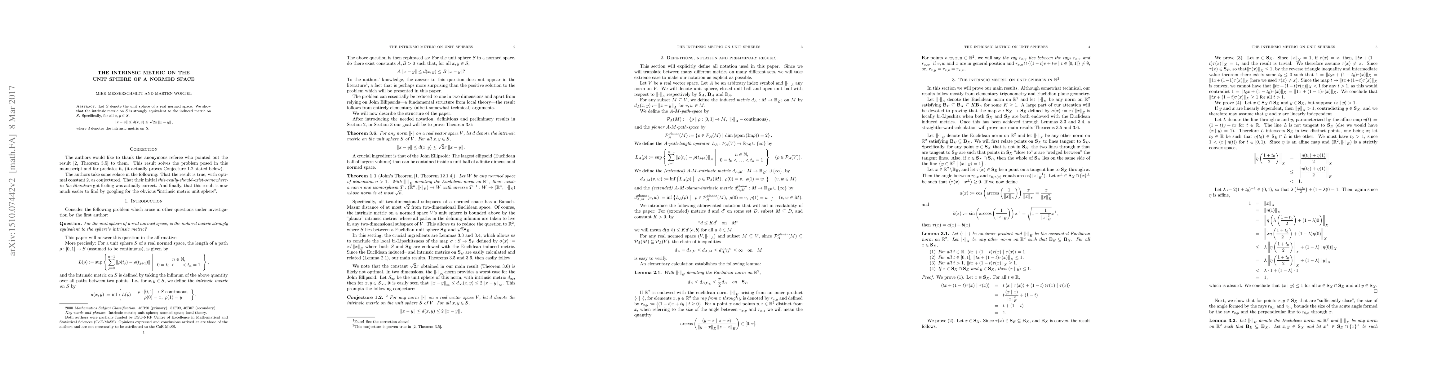 Let $S$ denote the unit sphere of a real normed space. We show that the intrinsic metric on $S$ is strongly equivalent to the induced metric on $S$. Specifically, for all $x,y\in S$, \[ \|x-y\|\leq d(x,y)\leq\sqrt{2}\pi\|x-y\|, \] where $d$ denotes the intrinsic metric on $S$.