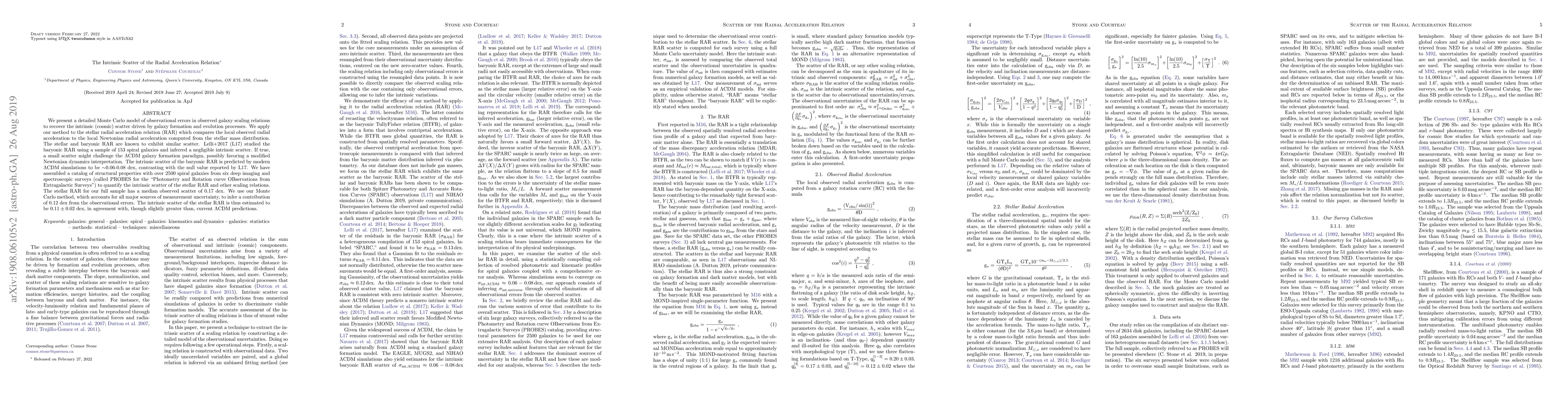 This study uses a Monte Carlo model to quantify the intrinsic scatter in the stellar radial acceleration relation (RAR) by accounting for observational errors. The intrinsic scatter of the stellar RAR is estimated to be 0.11±0.02 dex, slightly greater than the predictions of the LCDM galaxy formation paradigm.