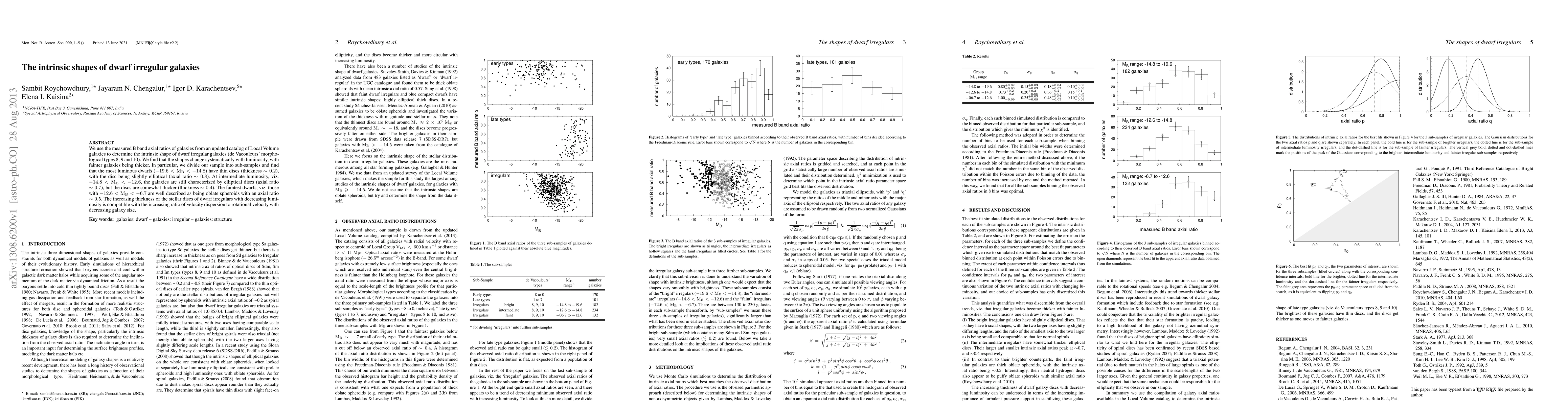 This study analyzes the intrinsic shapes of dwarf irregular galaxies using B band axial ratios, revealing that luminosity correlates with shape: the most luminous have thin, slightly elliptical discs, while fainter galaxies exhibit thicker discs and transition to oblate spheroids. The trend aligns with the increasing velocity dispersion to rotational velocity ratio in smaller galaxies.