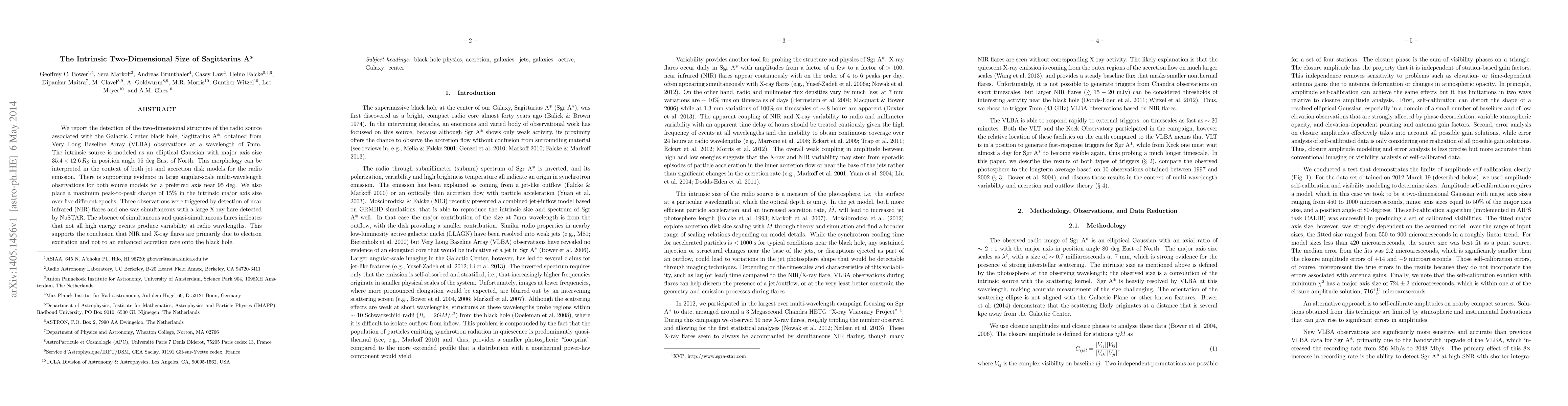 We report the detection of the two-dimensional structure of the radio source associated with the Galactic Center black hole, Sagittarius A*, obtained from Very Long Baseline Array (VLBA) observations at a wavelength of 7mm. The intrinsic source is modeled as an elliptical Gaussian with major axis size 35.4 x 12.6 R_S in position angle 95 deg East of North. This morphology can be interpreted in the context of both jet and accretion disk models for the radio emission. There is supporting evidence in large angular-scale multi-wavelength observations for both source models for a preferred axis near 95 deg. We also place a maximum peak-to-peak change of 15% in the intrinsic major axis size over five different epochs. Three observations were triggered by detection of near infrared (NIR) flares and one was simultaneous with a large X-ray flare detected by NuSTAR. The absence of simultaneous and quasi-simultaneous flares indicates that not all high energy events produce variability at radio wavelengths. This supports the conclusion that NIR and X-ray flares are primarily due to electron excitation and not to an enhanced accretion rate onto the black hole.