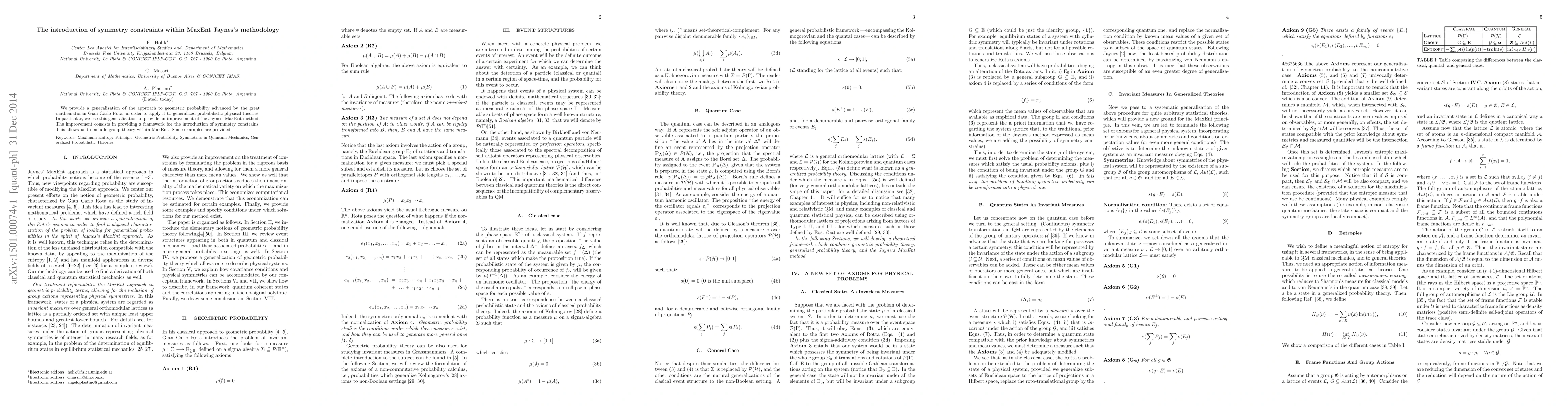 We provide a generalization of the approach to geometric probability advanced by the great mathematician Gian Carlo Rota, in order to apply it to generalized probabilistic physical theories. In particular, we use this generalization to provide an improvement of the Jaynes' MaxEnt method. The improvement consists in providing a framework for the introduction of symmetry constrains. This allows us to include group theory within MaxEnt. Some examples are provided.