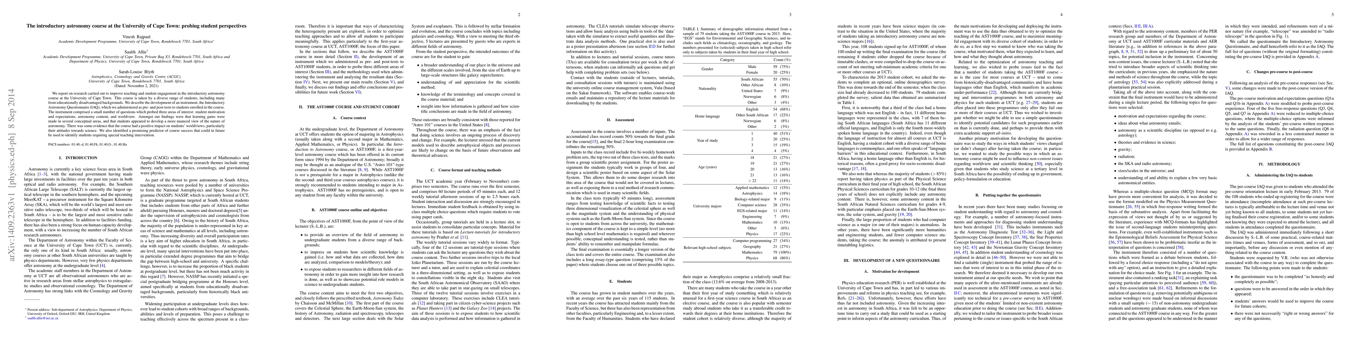 Research employed development of the Introductory Astronomy Questionnaire (IAQ) as pre- and post-tests to probe student perspectives in the introductory astronomy course at the University of Cape Town, focusing on motivation, astronomy content, and worldview.