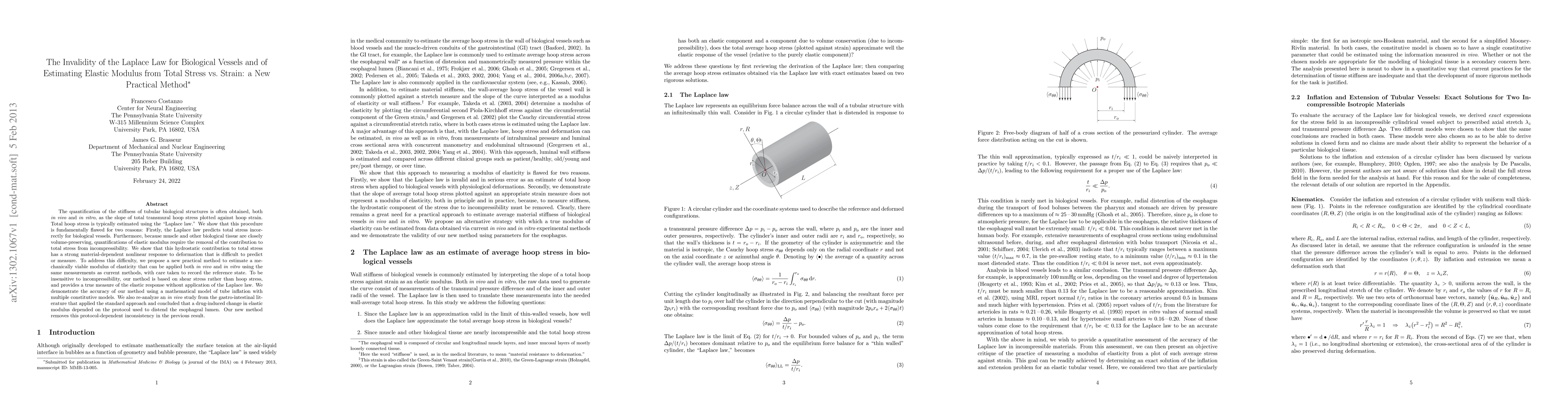 The quantification of the stiffness of tubular biological structures is often obtained, both in vivo and in vitro, as the slope of total transmural hoop stress plotted against hoop strain. Total hoop stress is typically estimated using the "Laplace law." We show that this procedure is fundamentally flawed for two reasons: Firstly, the Laplace law predicts total stress incorrectly for biological vessels. Furthermore, because muscle and other biological tissue are closely volume-preserving, quantifications of elastic modulus require the removal of the contribution to total stress from incompressibility. We show that this hydrostatic contribution to total stress has a strong material-dependent nonlinear response to deformation that is difficult to predict or measure. To address this difficulty, we propose a new practical method to estimate a mechanically viable modulus of elasticity that can be applied both in vivo and in vitro using the same measurements as current methods, with care taken to record the reference state. To be insensitive to incompressibility, our method is based on shear stress rather than hoop stress, and provides a true measure of the elastic response without application of the Laplace law. We demonstrate the accuracy of our method using a mathematical model of tube inflation with multiple constitutive models. We also re-analyze an in vivo study from the gastro-intestinal literature that applied the standard approach and concluded that a drug-induced change in elastic modulus depended on the protocol used to distend the esophageal lumen. Our new method removes this protocol-dependent inconsistency in the previous result.