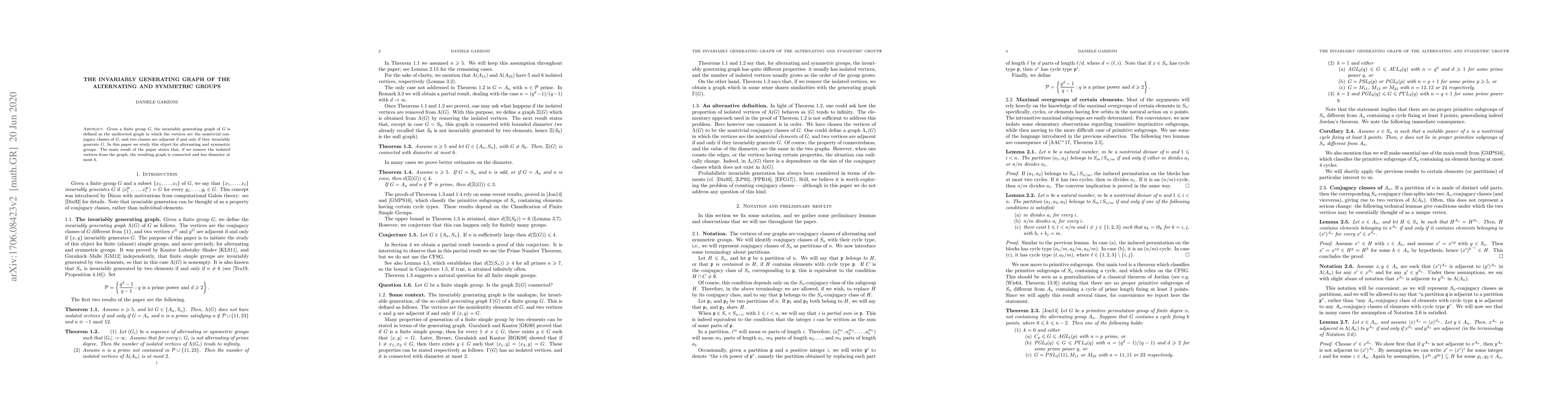 Given a finite group $G$, the invariably generating graph of $G$ is defined as the undirected graph in which the vertices are the nontrivial conjugacy classes of $G$, and two classes are adjacent if and only if they invariably generate $G$. In this paper we study this object for alternating and symmetric groups. The main result of the paper states that, if we remove the isolated vertices from the graph, the resulting graph is connected and has diameter at most $6$.