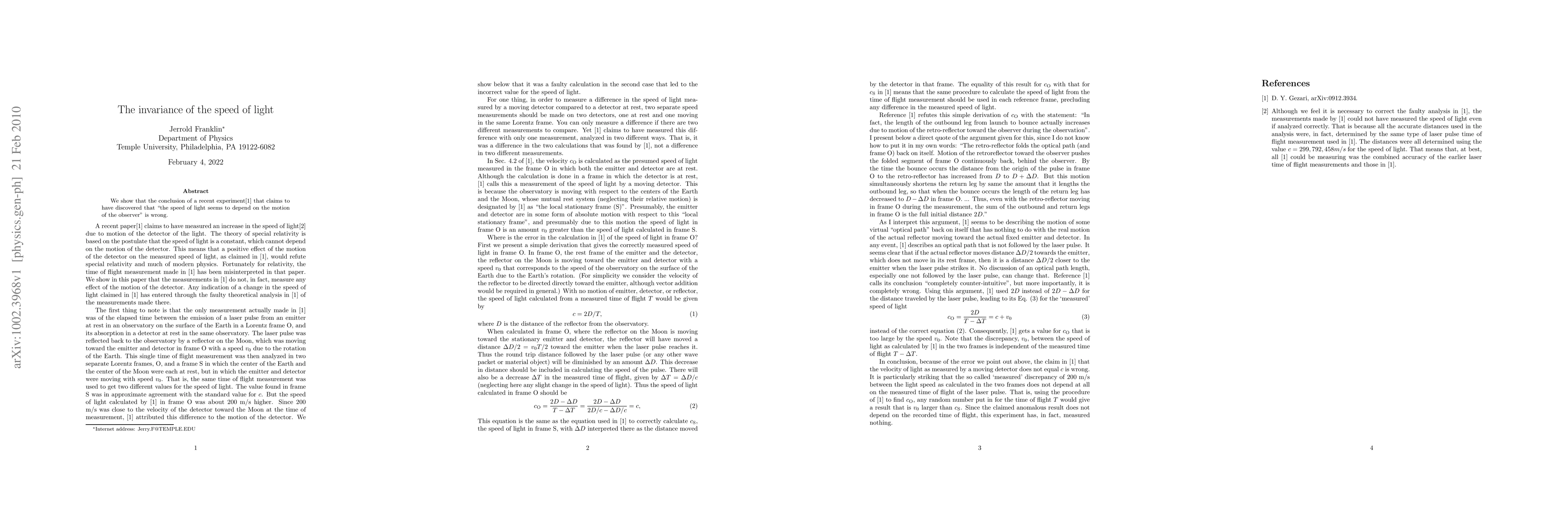 Summary: This paper refutes the findings of a recent experiment suggesting that the speed of light varies with the observer's motion, reaffirming the principle of the invariance of the speed of light. The study concludes that the previous experiment's results were erroneous.