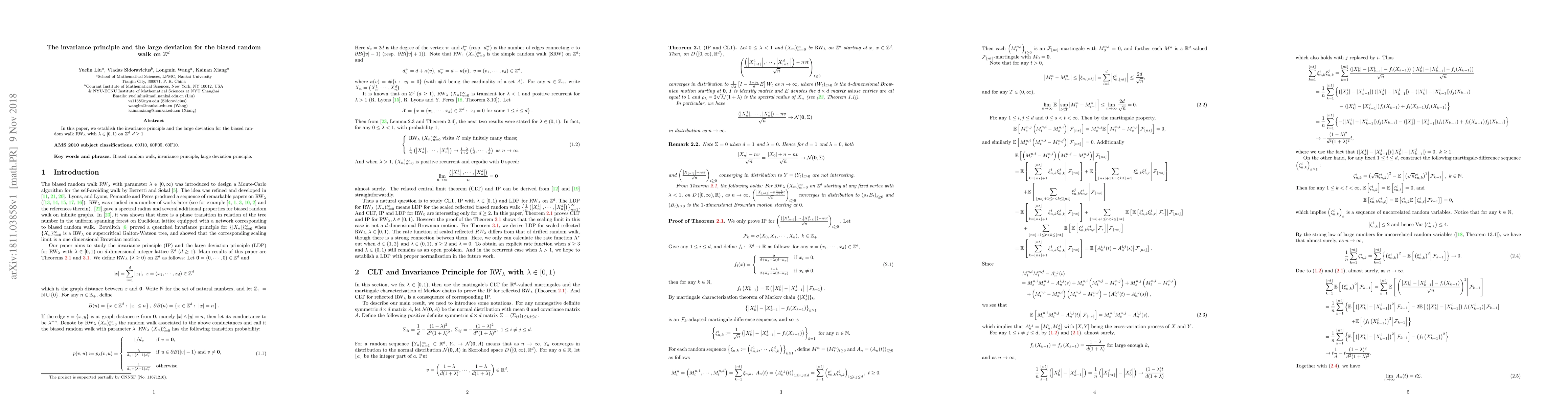 In this paper, we establish the invariance principle and the large deviation for the biased random walk $RW_{\lambda}$ with $\lambda \in [0,1)$ on $\mathbb{Z}^d, d\geq 1$.