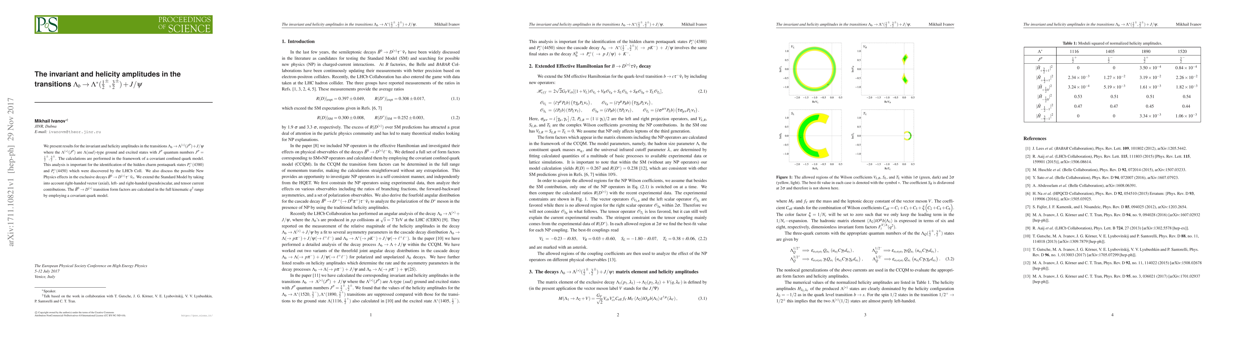 We present results for the invariant and helicity amplitudes in the transitions $\Lambda_b\to\Lambda^{(\ast)}(J^P)+J/\psi$ where the $\Lambda^{(\ast)}(J^P)$ are $\Lambda(sud)$-type ground and excited states with $J^P$ quantum numbers $J^P=\frac12^{\pm},\frac32^{\pm}$. The calculations are performed in the framework of a covariant confined quark model. This analysis is important for the identification of the hidden charm pentaquark states $P_c^+(4380)$ and $P_c^+(4450)$ which were discovered by the LHCb Coll. We also discuss the possible New Physics effects in the exclusive decays $\bar{B}^0 \to D^{(\ast)} \tau^- \bar{\nu}_{\tau}$. We extend the Standard Model by taking into account right-handed vector (axial), left- and right-handed (pseudo)scalar, and tensor current contributions. The $\bar{B}^0 \to D^{(\ast)}$ transition form factors are calculated in the full kinematic $q^2$ range by employing a covariant quark model.