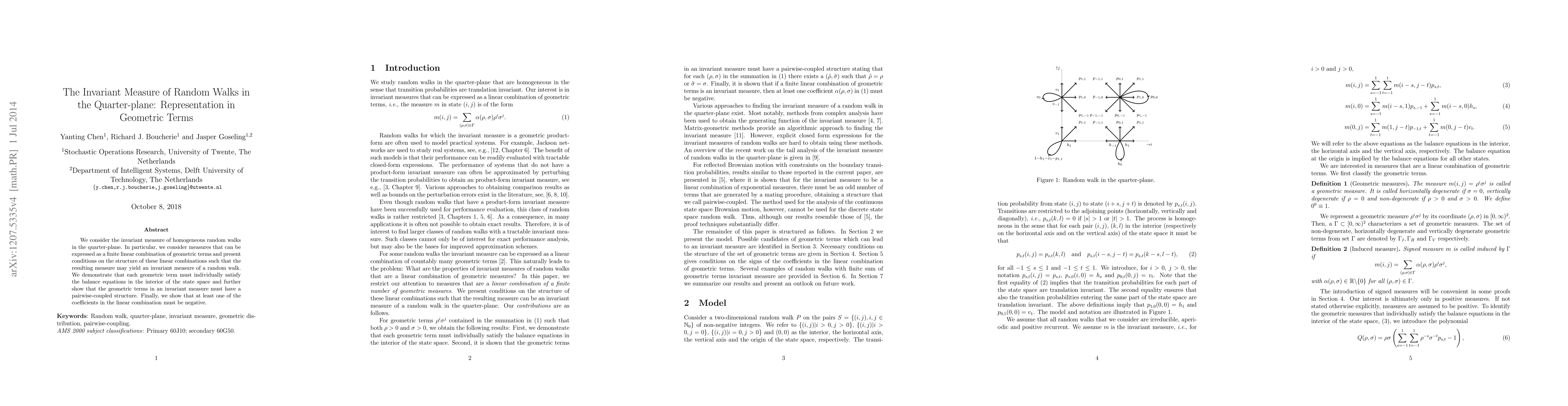 The paper investigates how to represent invariant measures of random walks in the quarter-plane as finite linear combinations of geometric terms. It finds that these terms must individually satisfy balance equations and have a pairwise-coupled structure, with at least one coefficient being negative.