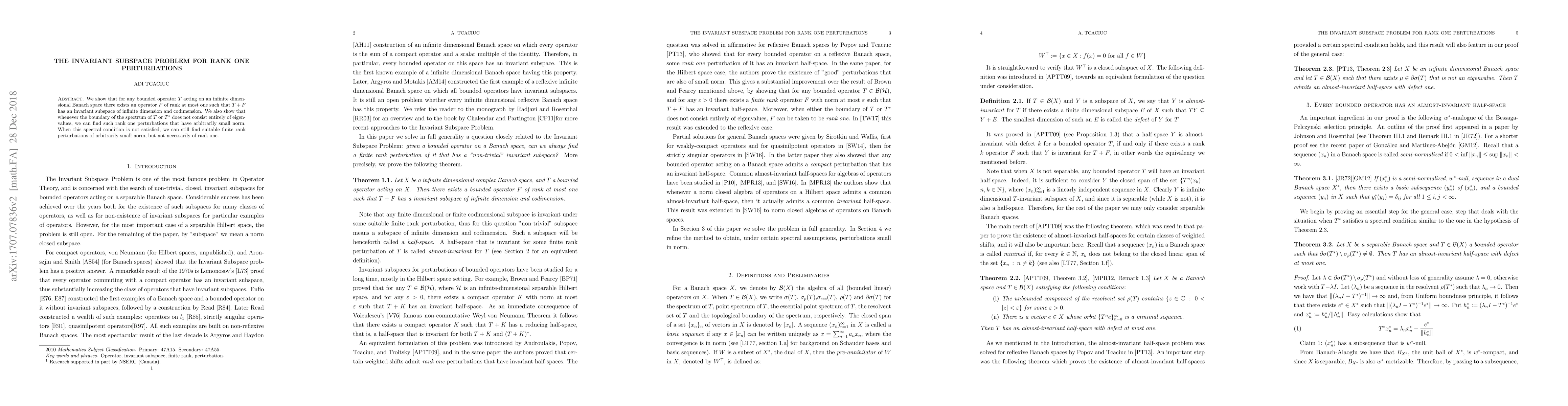 We show that for any bounded operator $T$ acting on an infinite dimensional Banach space there exists an operator $F$ of rank at most one such that $T+F$ has an invariant subspace of infinite dimension and codimension. We also show that whenever the boundary of the spectrum of $T$ or $T^*$ does not consist entirely of eigenvalues, we can find such rank one perturbations that have arbitrarily small norm. When this spectral condition is not satisfied, we can still find suitable finite rank perturbations of arbitrarily small norm, but not necessarily of rank one.