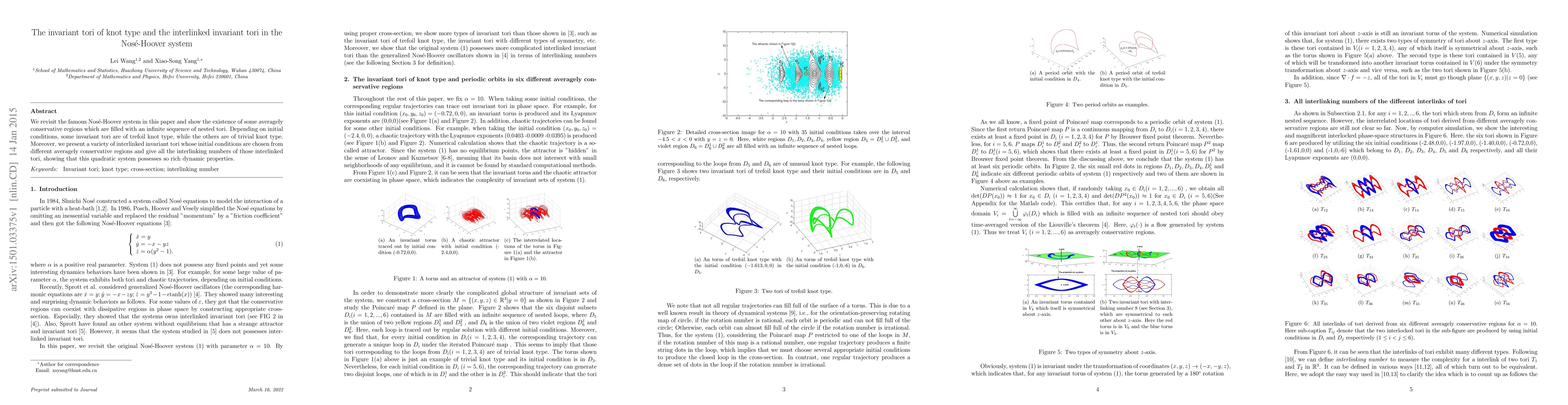We revisit the famous Nos\'e-Hoover system in this paper and show the existence of some averagely conservative regions which are filled with an infinite sequence of nested tori. Depending on initial conditions, some invariant tori are of trefoil knot type, while the others are of trivial knot type. Moreover, we present a variety of interlinked invariant tori whose initial conditions are chosen from different averagely conservative regions and give all the interlinking numbers of those interlinked tori, showing that this quadratic system possesses so rich dynamic properties.