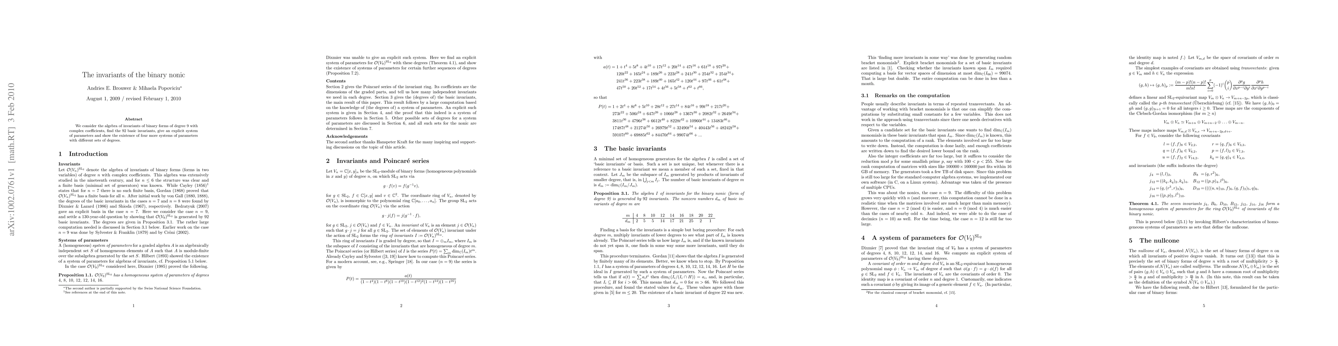 This paper identifies the 92 fundamental invariants of binary nonic forms (degree 9) with complex coefficients, provides an explicit system of parameters, and demonstrates the existence of four additional parameter systems with distinct degree sets.