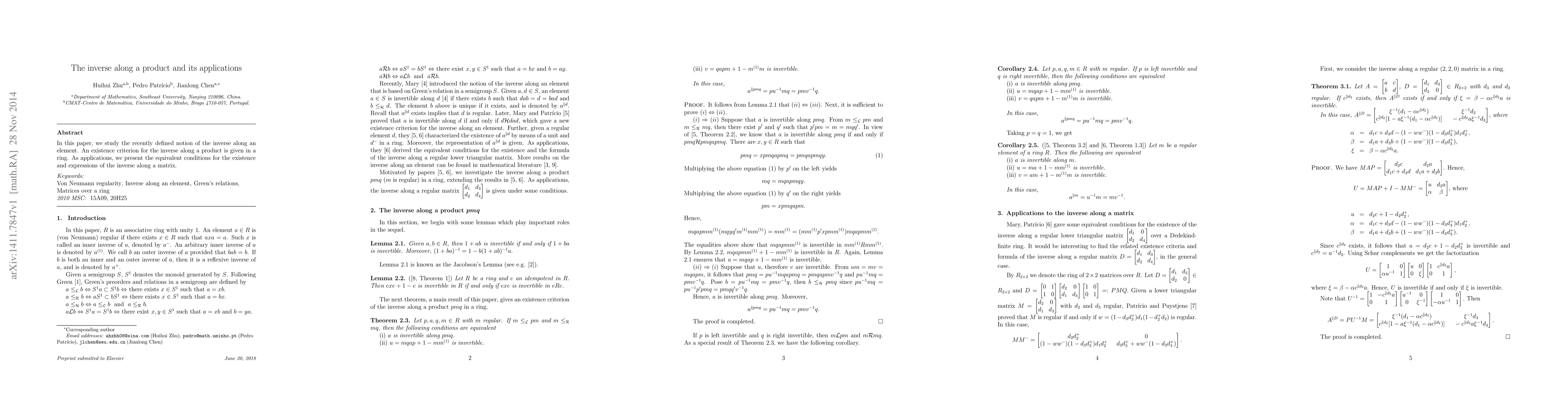 This paper explores the concept of inverse along an element in a ring, providing a criterion for the existence of the inverse along a product. It also applies these findings to matrices, presenting equivalent conditions and expressions for the inverse along a matrix.