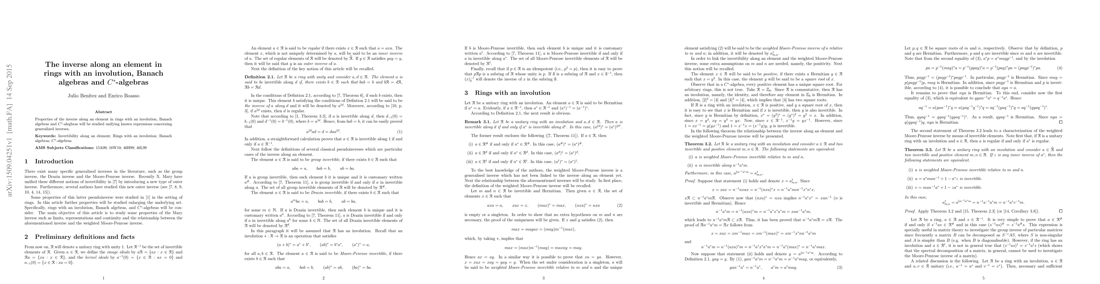 Properties of the inverse along an element in rings with an involution, Banach algebras and $C^*$-alegbras will be studied unifying known expressions concerning generalized inverses.