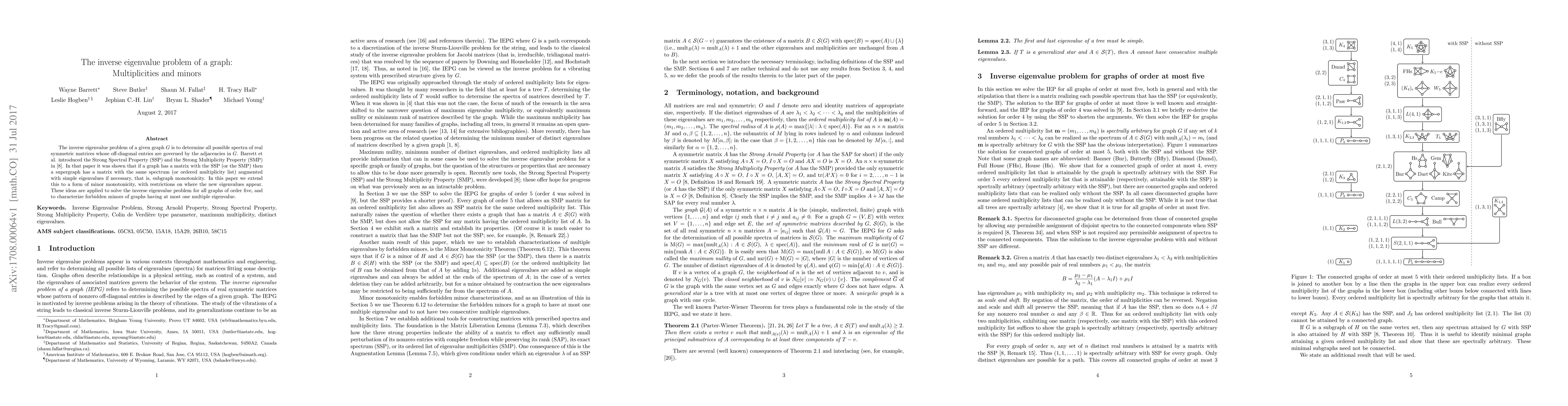 Researchers solved the inverse eigenvalue problem for graphs of order five, finding that certain properties can determine a graph's spectrum, and identified forbidden minors with at most one multiple eigenvalue.