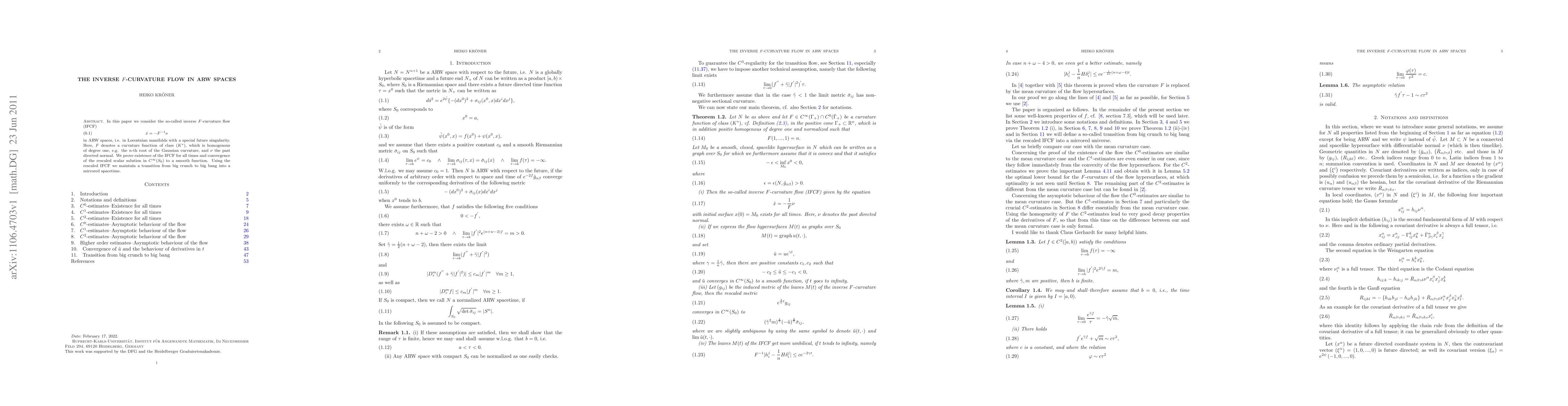 We consider the so-called inverse $F$-curvature flow (IFCF) $\dot x = -F^{-1}\nu$ in ARW spaces, i.e. in Lorentzian manifolds with a special future singularity. Here, $F$ denotes a curvature function of class $(K^*)$, which is homogenous of degree one, e.g. the $n$-th root of the Gaussian curvature, and $\nu$ the past directed normal. We prove existence of the IFCF for all times and convergence of the rescaled scalar solution in $C^{\infty}(S_0)$ to a smooth function. Using the rescaled IFCF we maintain a transition from big crunch to big bang into a mirrored spacetime.