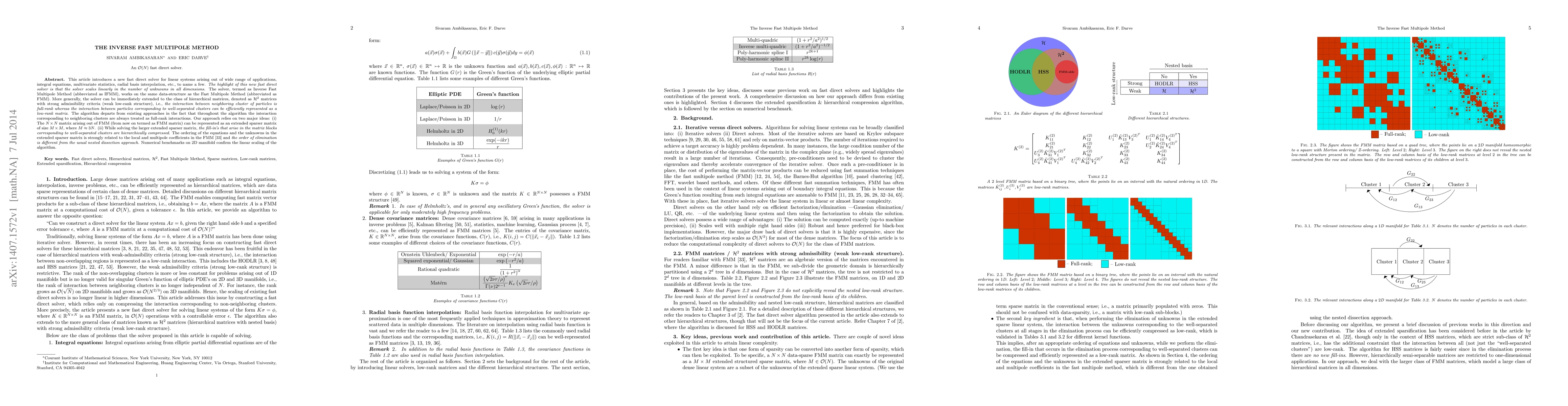 The Inverse Fast Multipole Method (IFMM) is a new fast direct solver for linear systems that scales linearly with the number of unknowns across all dimensions. Unlike existing methods, IFMM treats neighboring clusters as full-rank interactions and hierarchically compresses fill-ins from well-separated clusters, achieving linear scaling in numerical benchmarks.