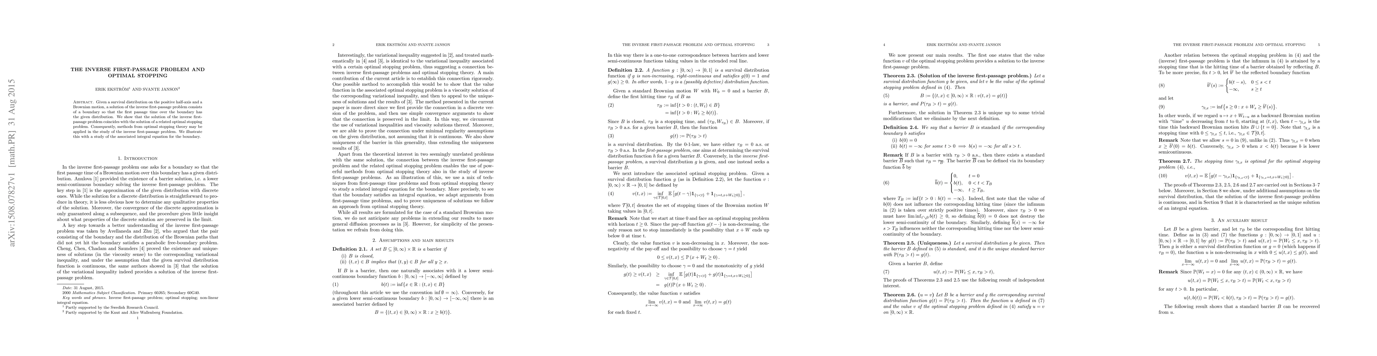This paper solves the inverse first-passage problem by identifying it with an optimal stopping problem, demonstrating that techniques from optimal stopping theory can be applied to determine the boundary for a given survival distribution and Brownian motion. The study also explores the associated integral equation for the boundary.