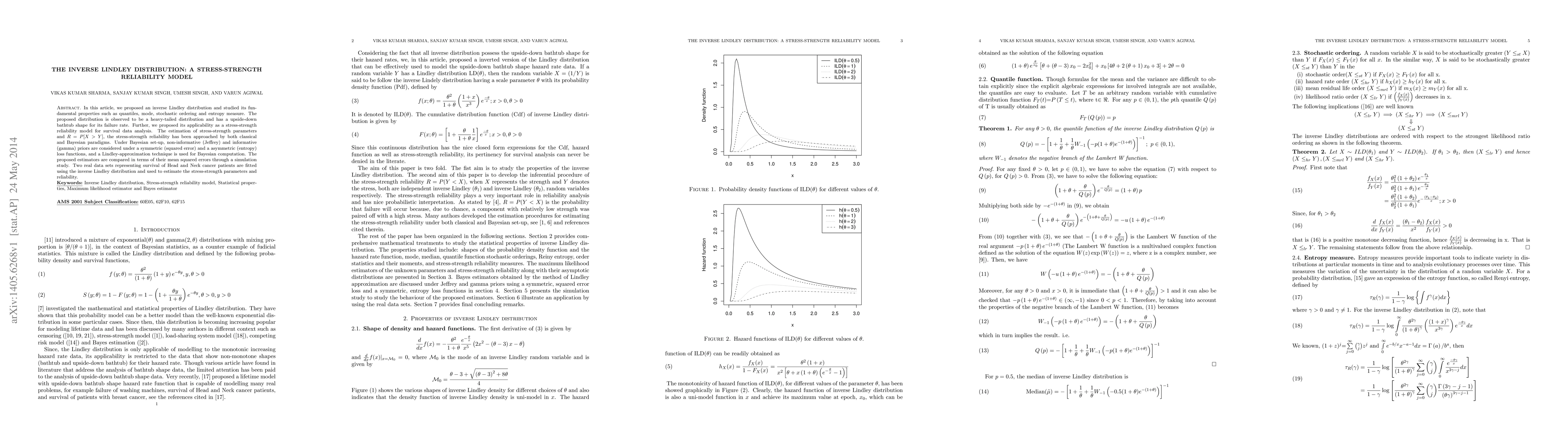 This paper introduces the inverse Lindley distribution, examining its properties and proposing it as a stress-strength reliability model. It compares classical and Bayesian estimation methods for stress-strength parameters and reliability, using real cancer survival data for validation.