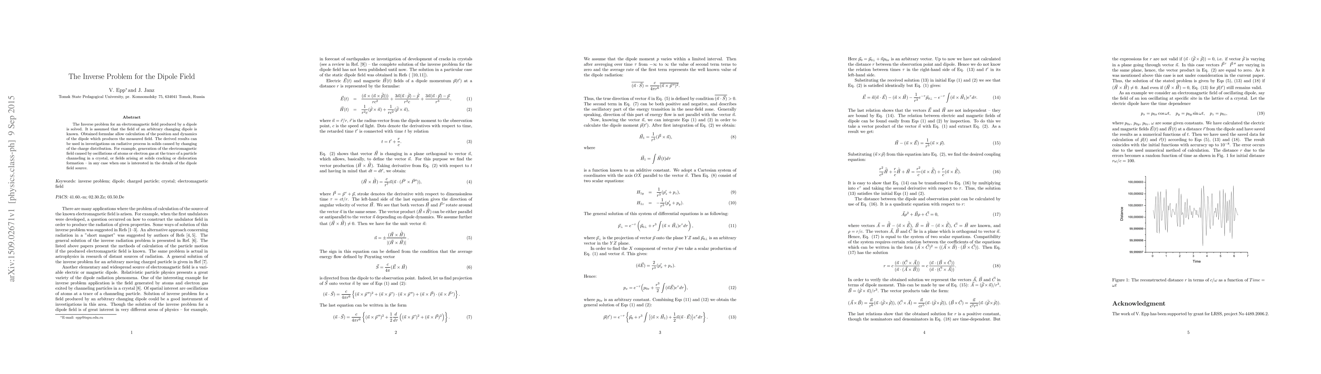 The Inverse problem for an electromagnetic field produced by a dipole is solved. It is assumed that the field of an arbitrary changing dipole is known. Obtained formulae allow calculation of the position and dynamics of the dipole which produces the measured field. The derived results can be used in investigations on radiative process in solids caused by changing of the charge distribution. For example, generation of the electromagnetic field caused by oscillations of atoms or electron gas at the trace of a particle channeling in a crystal, or fields arising at solids cracking or dislocation formation -- in any case when one is interested in the details of the dipole field source.