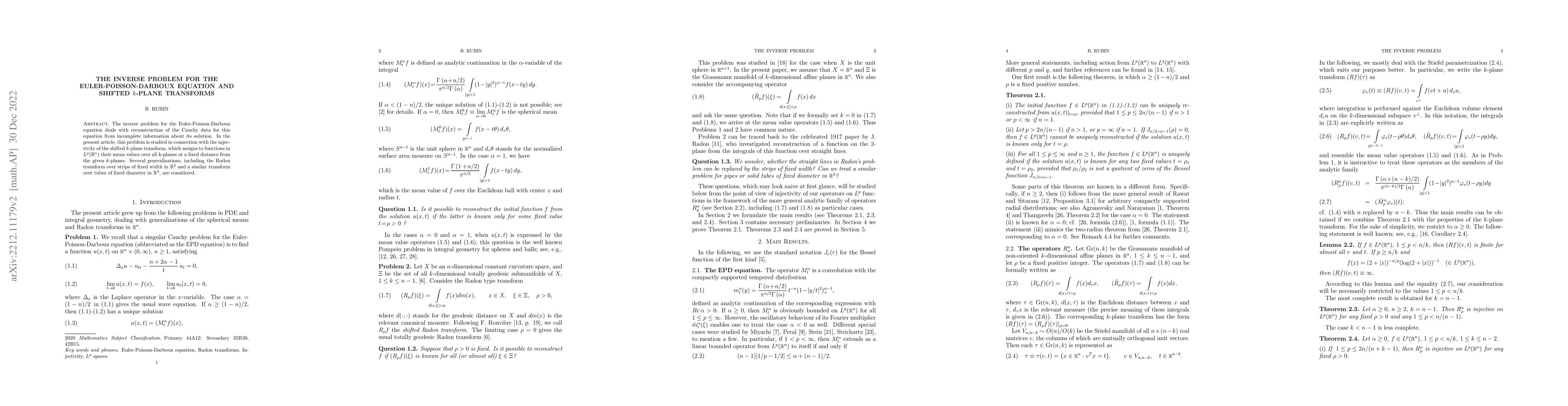 This paper investigates the inverse problem for the Euler-Poisson-Darboux equation, focusing on reconstructing Cauchy data from incomplete solution information. It examines the injectivity of the shifted $k$-plane transform, including generalizations like the Radon transform over strips and tubes.