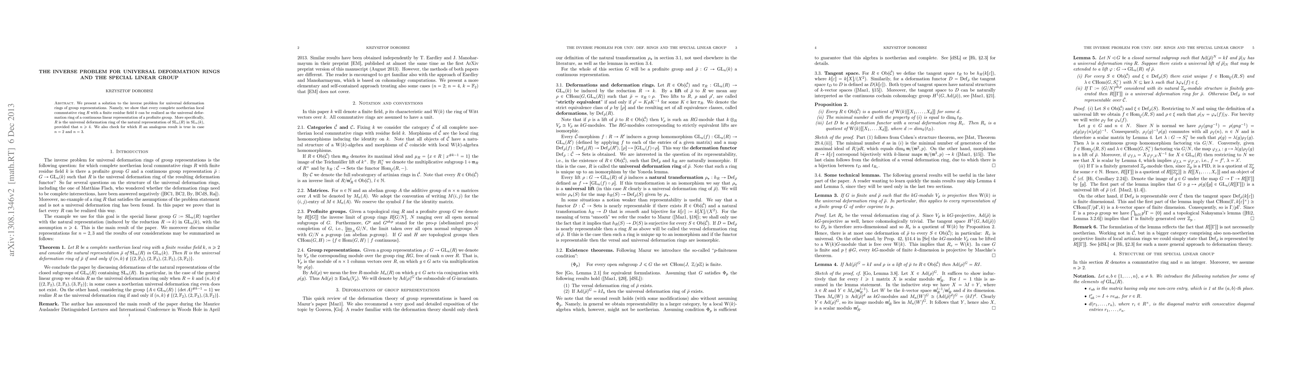 Researchers show that every complete noetherian local commutative ring R can be realized as a universal deformation ring of a continuous linear representation of a profinite group, specifically for SL_n(R) when n is at least 4.