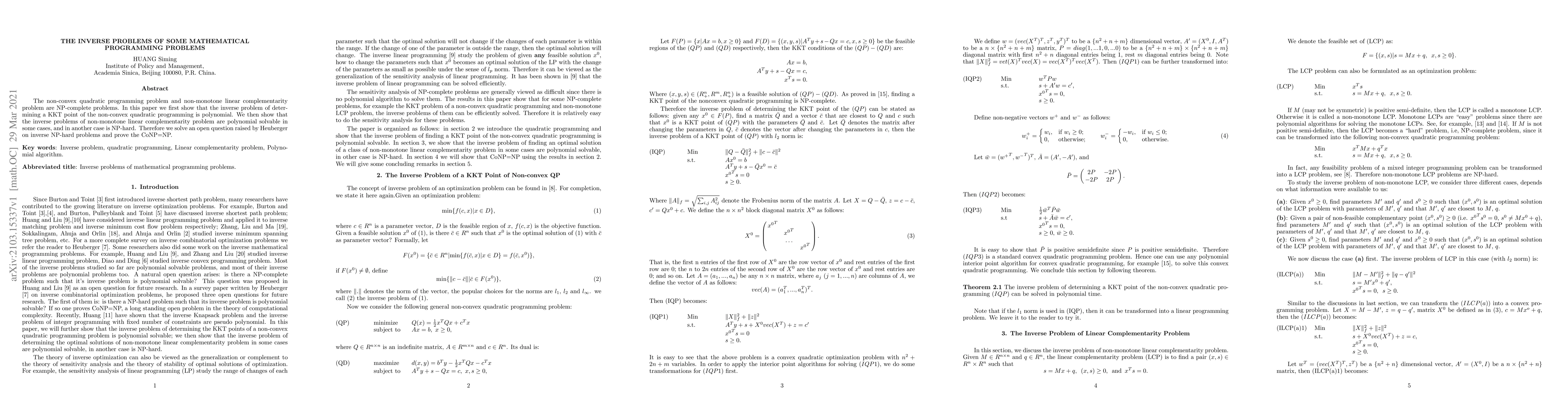 The non-convex quadratic orogramming problem and the non-monotone linear complementarity problem are NP-complete problems. In this paper we first show taht the inverse problem of determinning a KKT point of the non-convex quadratic programming problem is polynomial. We then show that the inverse problems of non-monotone linear complementarity problem are polynomial solvable in some cases, and in another case is NP-hard. Therefore we solve an open question raised by Heuberger on inverse NP-hard problems and prove that CoNP=NP.