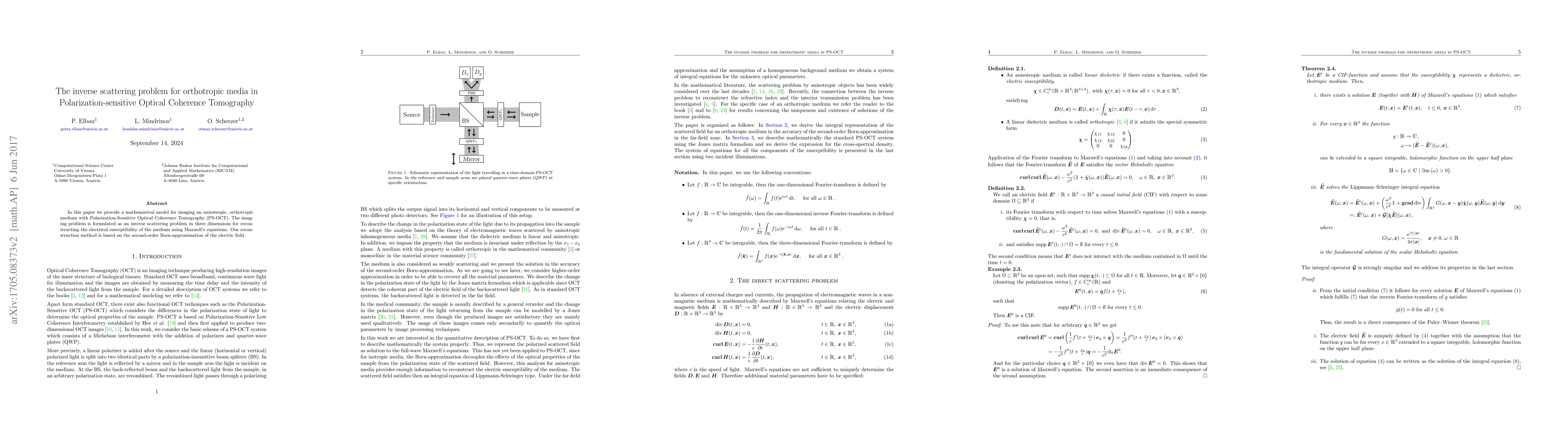 This paper develops a mathematical model for imaging orthotropic anisotropic media using Polarization-Sensitive Optical Coherence Tomography (PS-OCT), addressing the inverse scattering problem to reconstruct the medium's electrical susceptibility via Maxwell's equations and the second-order Born-approximation.