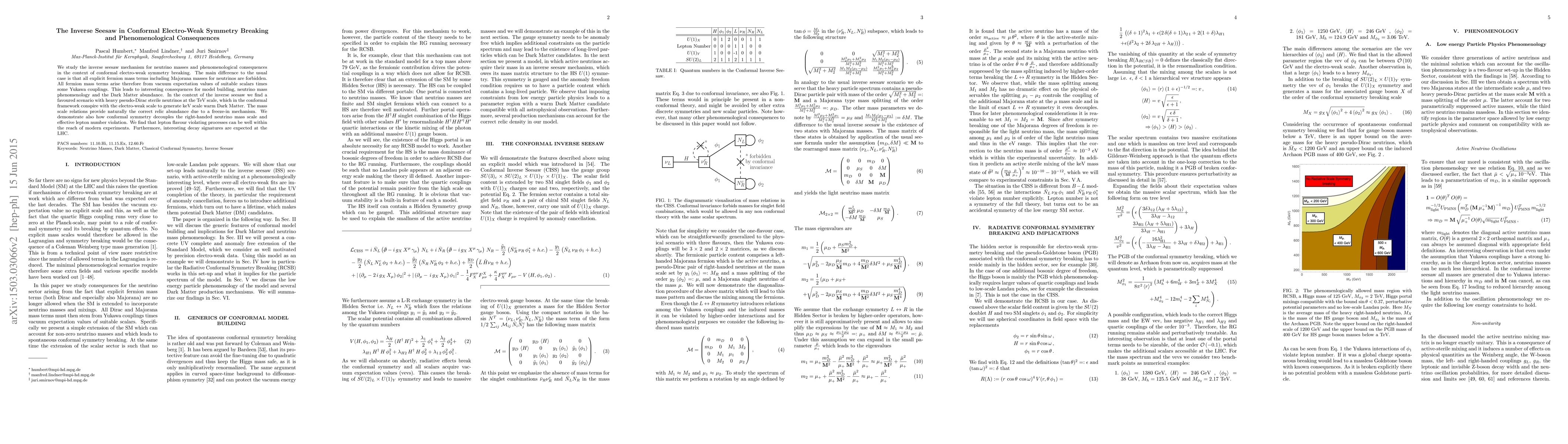 We study the inverse seesaw mechanism for neutrino masses and phenomenological consequences in the context of conformal electro-weak symmetry breaking. The main difference to the usual case is that all explicit fermion mass terms including Majorana masses for neutrinos are forbidden. All fermion mass terms arise therefore from vacuum expectation values of suitable scalars times some Yukawa couplings. This leads to interesting consequences for model building, neutrino mass phenomenology and the Dark Matter abundance. In the context of the inverse seesaw we find a favoured scenario with heavy pseudo-Dirac sterile neutrinos at the TeV scale, which in the conformal framework conspire with the electro-weak scale to generate keV scale warm Dark Matter. The mass scale relations provide naturally the correct relic abundance due to a freeze-in mechanism. We demonstrate also how conformal symmetry decouples the right-handed neutrino mass scale and effective lepton number violation. We find that lepton flavour violating processes can be well within the reach of modern experiments. Furthermore, interesting decay signatures are expected at the LHC.