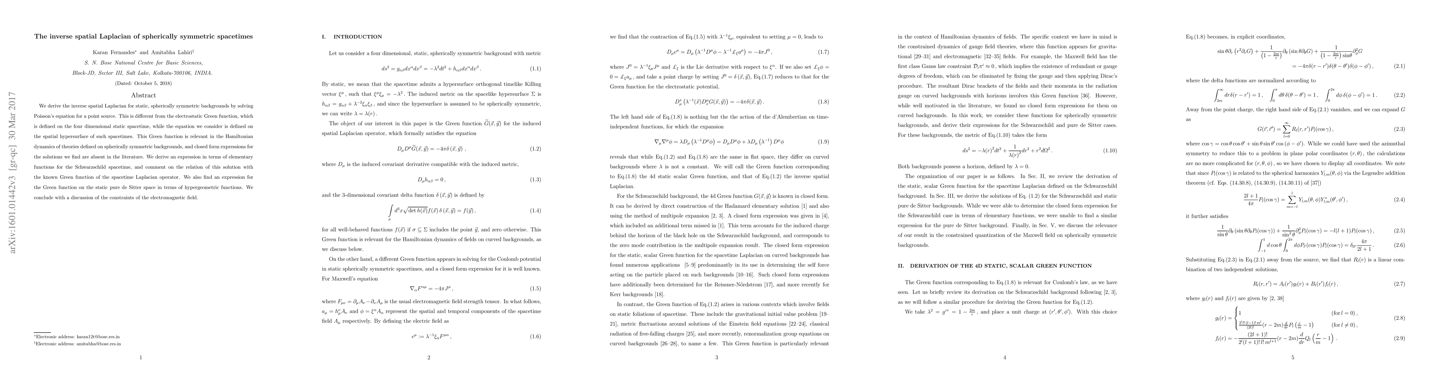 In this paper we derive the inverse spatial Laplacian for static, spherically symmetric backgrounds by solving Poisson's equation for a point source. This is different from the electrostatic Green function, which is defined on the four dimensional static spacetime, while the equation we consider is defined on the spatial hypersurface of such spacetimes. This Green function is relevant in the Hamiltonian dynamics of theories defined on spherically symmetric backgrounds, and closed form expressions for the solutions we find are absent in the literature. We derive an expression in terms of elementary functions for the Schwarzschild spacetime, and comment on the relation of this solution with the known Green function of the spacetime Laplacian operator. We also find an expression for the Green function on the static pure de Sitter space in terms of hypergeometric functions.