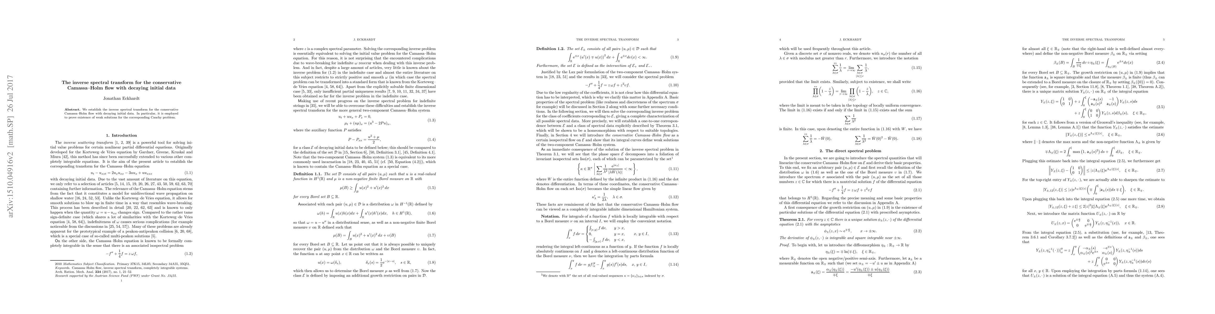 Summary: This paper establishes the inverse spectral transform for the conservative Camassa-Holm flow with decaying initial data, and uses it to demonstrate the existence of weak solutions for the associated Cauchy problem.