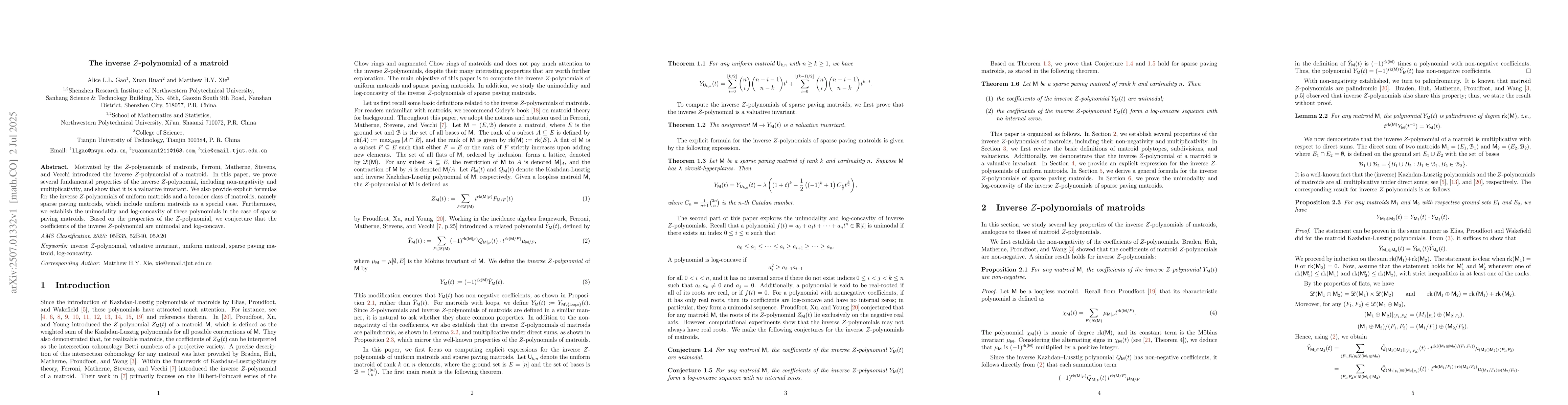 Motivated by the $Z$-polynomials of matroids, Ferroni, Matherne, Stevens, and Vecchi introduced the inverse $Z$-polynomial of a matroid. In this paper, we prove several fundamental properties of the inverse $Z$-polynomial, including non-negativity and multiplicativity, and show that it is a valuative invariant. We also provide explicit formulas for the inverse $Z$-polynomials of uniform matroids and a broader class of matroids, namely sparse paving matroids, which include uniform matroids as a special case. Furthermore, we establish the unimodality and log-concavity of these polynomials in the case of sparse paving matroids. Based on the properties of the $Z$-polynomial, we conjecture that the coefficients of the inverse $Z$-polynomial are unimodal and log-concave.