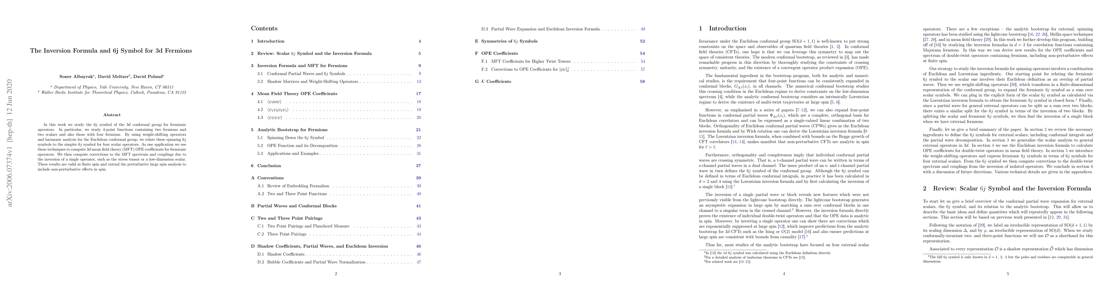 In this work we study the $6j$ symbol of the $3d$ conformal group for fermionic operators. In particular, we study 4-point functions containing two fermions and two scalars and also those with four fermions. By using weight-shifting operators and harmonic analysis for the Euclidean conformal group, we relate these spinning $6j$ symbols to the simpler $6j$ symbol for four scalar operators. As one application we use these techniques to compute $3d$ mean field theory (MFT) OPE coefficients for fermionic operators. We then compute corrections to the MFT spectrum and couplings due to the inversion of a single operator, such as the stress tensor or a low-dimension scalar. These results are valid at finite spin and extend the perturbative large spin analysis to include non-perturbative effects in spin.